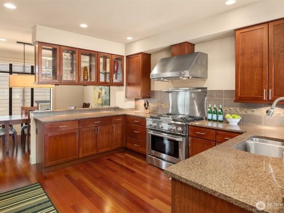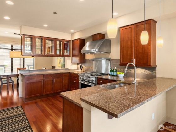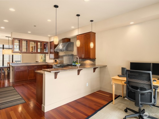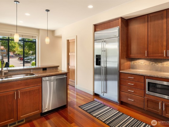 Nestled in Kirkland’s coveted Moss Bay, this end-unit townhome exudes luxury just steps from the lake, parks, Google, and vibrant downtown waterfront. Soaring ceilings, walls of windows, and two balconies showcase panoramic views of Lake WA, the Olympics, and lush garden lawn. Rich cherry floors and custom cabinetry define the chef’s kitchen, featuring top appliances and flowing seamlessly to dining + spacious living room with balcony—ideal for al fresco grilling. Upstairs, 2 en-suite beds await, including tranquil primary retreat with private balcony, fireplace, soaking tub, and walk-in closet. Flexible main-floor bonus w/ fireplace, wet bar, and full bath serves beautifully as 3rd bed/guest suite. Pre-inspected, turnkey, impeccable!