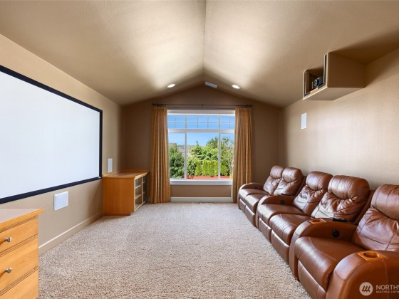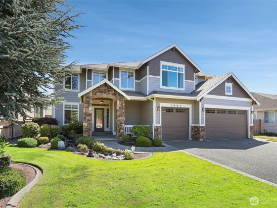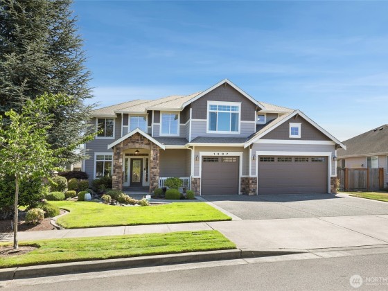 REFRESHED & BACK on market!! This elegant 4 bed/ 3 bath, custom home received some new carpet & paint in parts of the home. The main level offers a versatile bedroom perfect for guests or a home office. Gourmet kitchen w/ granite island, premium appls, & opens to spacious living & dining areas w/ a cozy gas fireplace & rich rustic hardwood floors. Upstairs, unwind in the expansive primary suite with a 5-pc bathroom & walk-in closet, enjoy movie nights in the fully equipped media room, or hang out in the bonus/playroom. Custom millwork throughout elevates this home’s character. Don’t miss the stunning exterior waterfall feature, 3-car garage & built-in vacuum system. Recliners in Media room stay with the home & back fence is being replaced.