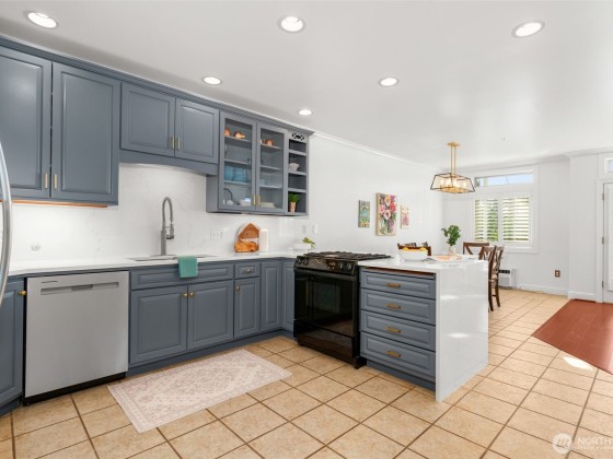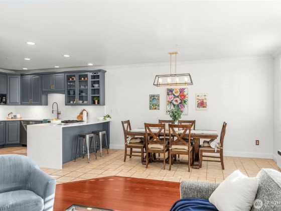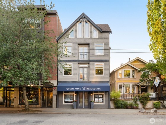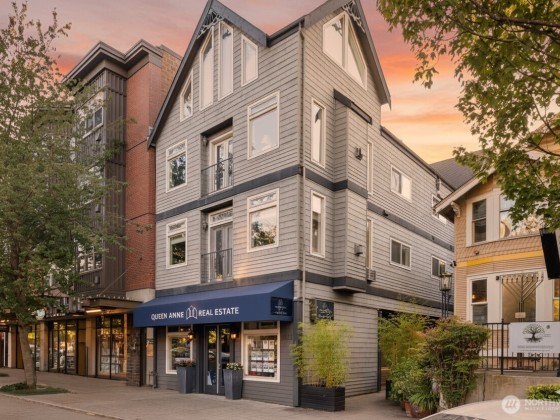 Stunning end unit showcasing designer spaces in a boutique building on the top of Queen Anne! Sited on the Avenue yet unit is in the quiet back half of the building. Spacious floorplan opens to Living room w 9' ceiling height, statement gas fireplace, oversized windows & west-facing Juliette balcony. Open kitchen design: chefs workspace includes newer cabinetry, slab counters with waterfall peninsula. Dining room can fit a real table w effortless connectivity to both living & kitchen. Primary suite has walk-in closet & it's own 3/4 bath. Elevator, garage parking, storage unit, updated/refreshed baths, laundry in-unit & AC. Unparalleled top of QA location w a plethora of amenities right out your front door. Truly a cherished opportunity!