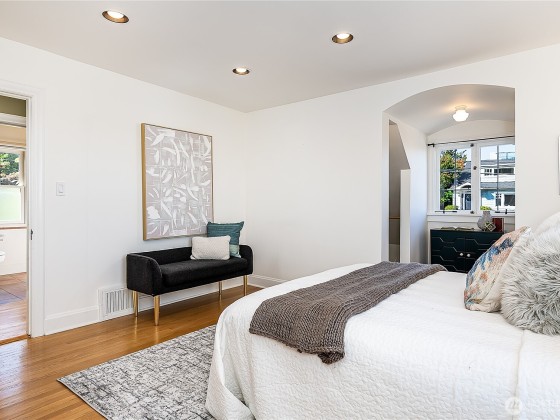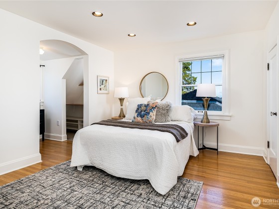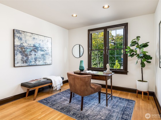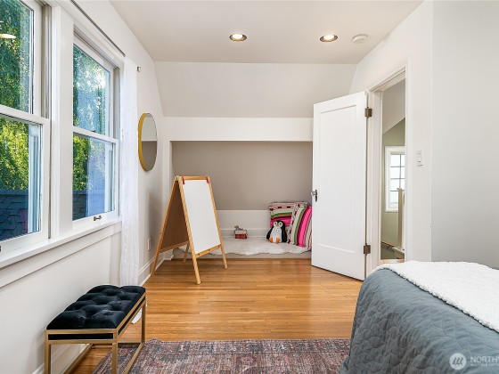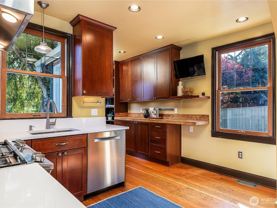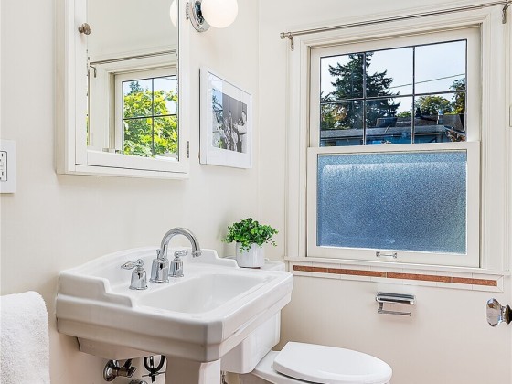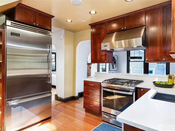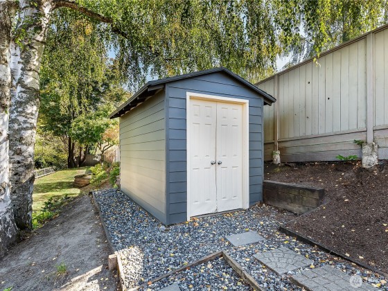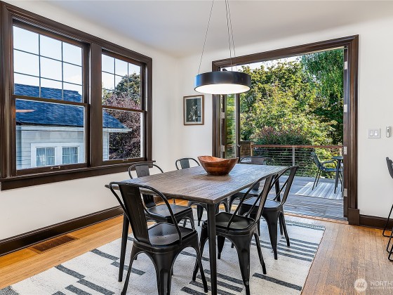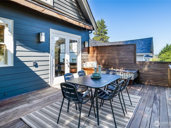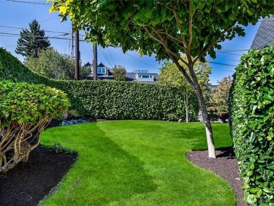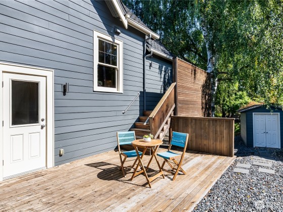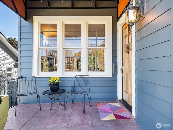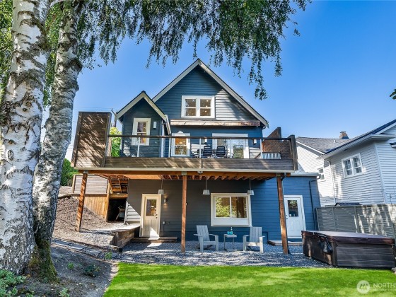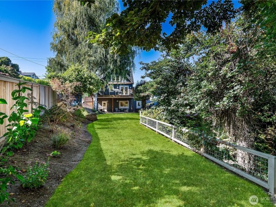 Beautifully restored QA home w/ timeless character showcases hardwood floors, coved ceilings, original leaded glass windows streaming western sunlight & cozy fireplace w/original tile. Entertainment-sized dining room w/French doors lead to a spacious deck, retractable awning & outdoor fireplace, overlooking an expansive, beautifully landscaped backyard sanctuary w/raised garden beds, plum tree & greenbelt. Gourmet kitchen w/high-end stainless appliances & sleek countertops. Main floor includes den/office & remodeled bath. 3 bedrooms/1 bath upstairs w/territorial views. Lower level w/high ceilings is media-ready, perfect for snuggling on an over-sized couch. 1 car off St parking. Close to local shops, parks, cafes, schools & transit.