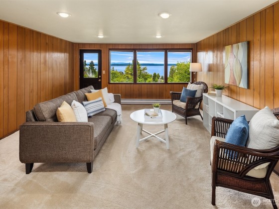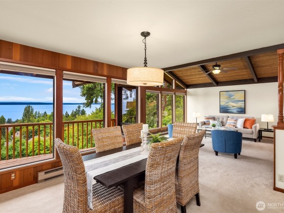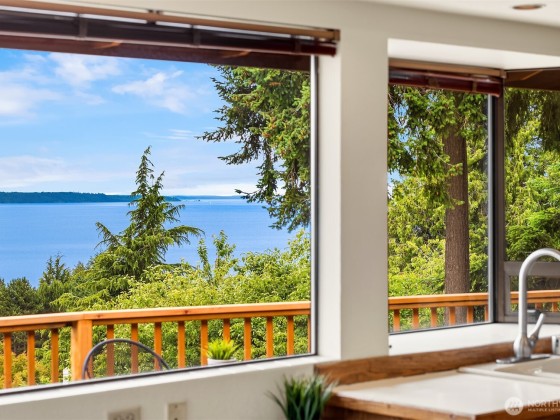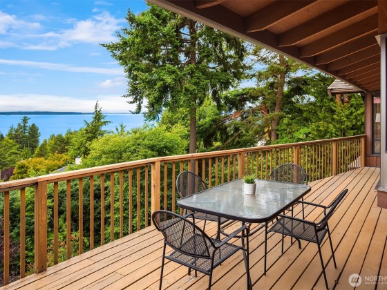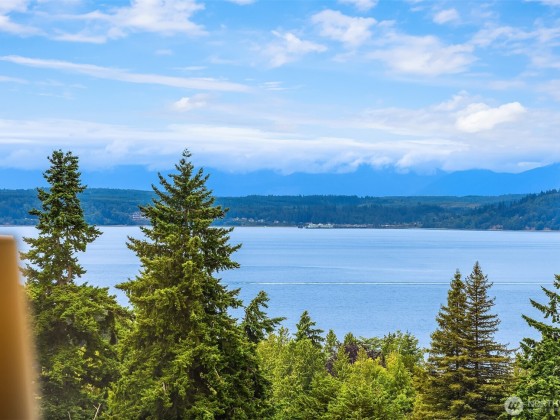 Panoramic, mesmerizing sound, strait & mountain views from each level of this extraordinary NW Contemporary home. Located in a prime location on a private drive in Seaview, enjoy vaulted ceilings & simple natural light from the wall of windows in the living/dining room/kitchen, perfect for entertaining! Breathtaking views from the main floor primary bedroom with en suite and a private deck. The versatile lower level offers a large bonus room + 3 bedrooms, 1.75 baths w/ MIL potential. Envision the additional potential in the unfinished lower level shop area. Enjoy a game of pickle ball on the sports court. This quiet neighborhood provides easy access for commuting, close proximity to downtown Edmonds shops, restaurants, marina & beachfront.