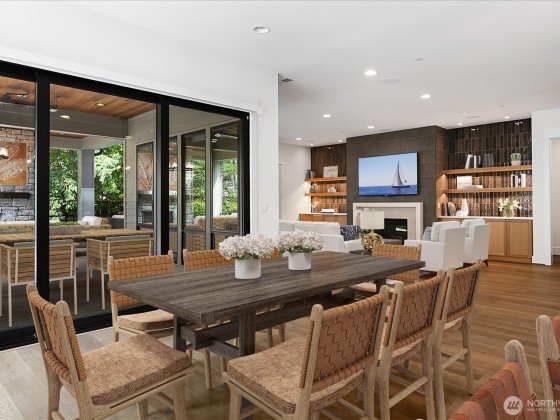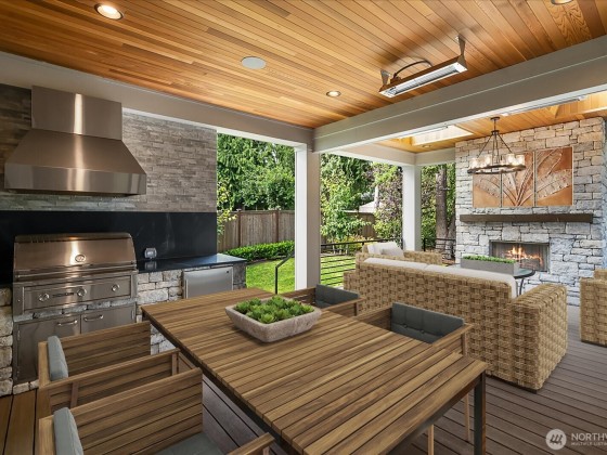 Welcome to this like-new, beautiful JayMarc modern farmhouse resale, located on a quiet cul-de-sac in the highly desirable location of Enatai. Entertain in the kitchen like a pro with a seamless indoor/outdoor connection to the covered bbq area & gas fireplace. Ten foot ceilings and a multitude of windows flood the space with natural light. Downstairs, the private guest quarters are positioned perfectly for extended stays. Upstairs, retreat to the sumptuous primary with lavish bathroom w/heated floors & oversized shower/tub. In addition to 3 more bedrooms upstairs, you will enjoy the large media & bonus rooms plus laundry room with 2 sets of washers & dryers. 3 car garage, AC, fully fenced level yard with sprinkler system. Virtual staging