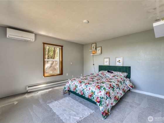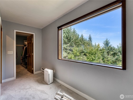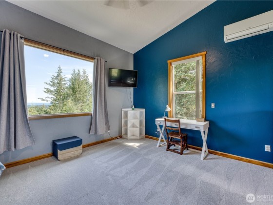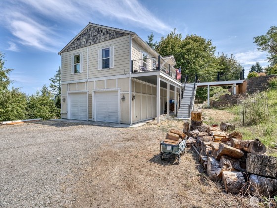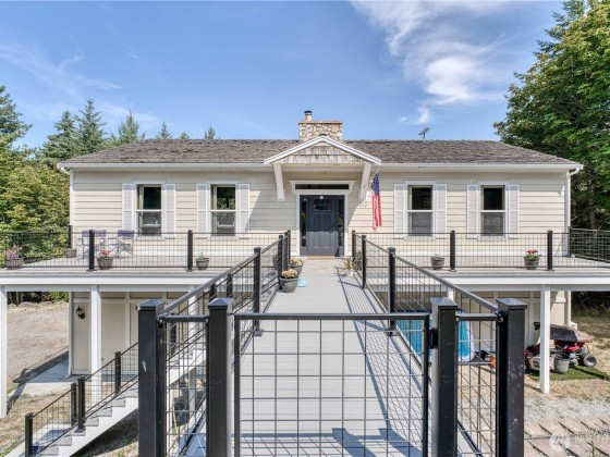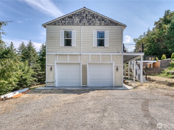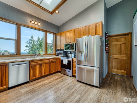Spacious Bell Hill home with stunning saltwater views! This inviting property features an open floor plan with vaulted ceilings, a cozy wood-burning stove, and panoramic windows showcasing the Strait. The large kitchen includes cherry cabinets, tiled countertops, and newer stainless steel appliances. Main floor offers a bedroom, bonus office space, and a 3/4 bath, with all-new flooring throughout. Downstairs you'll find two generous bedrooms, a full bath, and direct access to a 700+ sq ft attached 2-car garage. Backing to a greenbelt, the home offers serene privacy in a lush, natural setting.