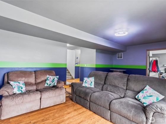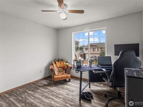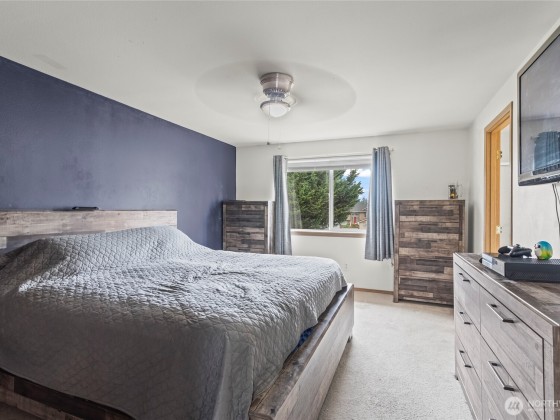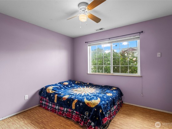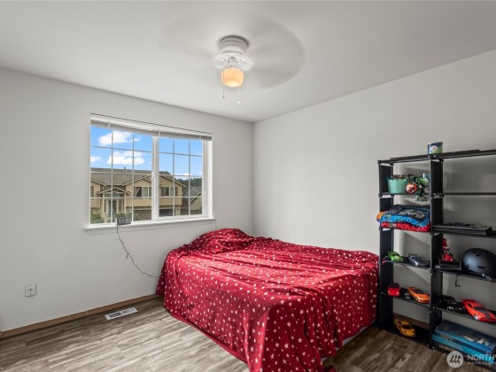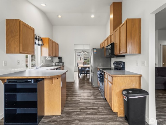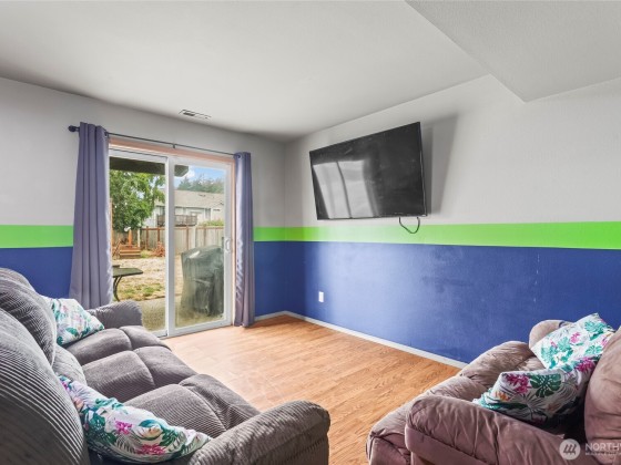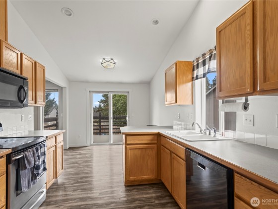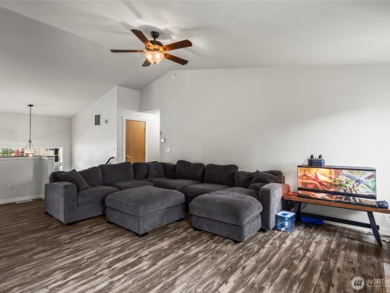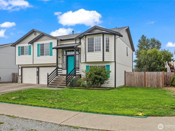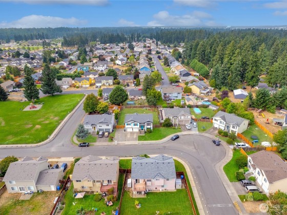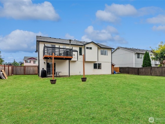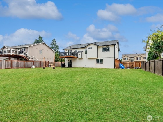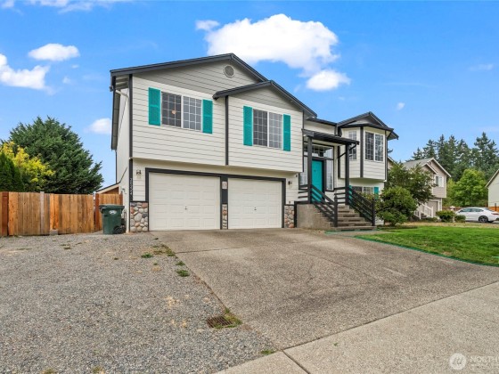This spacious 5-bedroom, 3-bath home sits on a large, fully fenced quarter-acre lot—perfect for entertaining, relaxing, or gardening. The open layout features vaulted ceilings, a gas fireplace, and both formal and casual dining areas. The kitchen flows seamlessly into the main living space, making it easy to host or unwind. Upstairs, the primary suite includes a tile-surround soaking tub and separate shower. Downstairs offers a full bath and a second living area—ideal as a lounge, game room, or hangout space—that opens directly to the private backyard. Located next to a wide open field with a sport court and playground, and just minutes from South Hill or Graham shopping and dining, with easy access to major arterials.