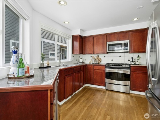 Welcome home to this turn key, three story town house in the heart of Leschi. Built in 2003, the home boasts 3 bedrooms, and 3 bathrooms in over 1600 square feet. The light and bright airy spaces offer western facing views of downtown. Entertain friends in the open concept main floor with granite tile kitchen counters, stainless steel appliances, gas range, eating space and gas fireplace. Luxuriate in your own private primary suite with 5 piece bath including jetted tub, walk in closet, downtown and territorial views. Plenty of room to park your car or toys in the two car attached garage. No HOA No Dues. Move in and start enjoying the next chapter of your story. Inspection and sewer scope available.