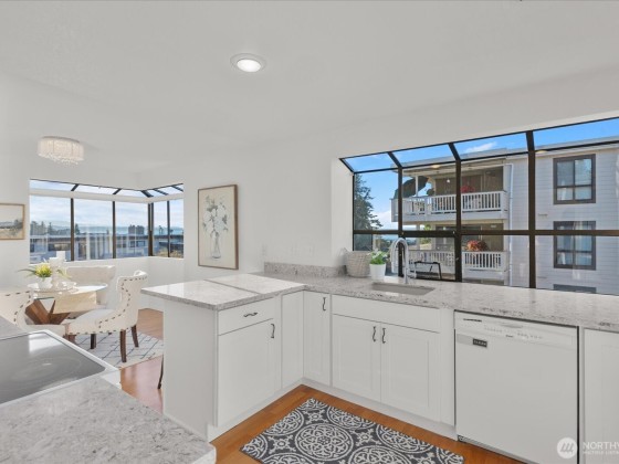 Beautifully remodeled NW corner view unit in downtown Edmonds w/rare 356 sq ft private garage. This light-filled, single-level condo features 2 bedrooms, 2 baths in classic, well-maintained small building. Fabulous remodeled kitchen with new cabinetry & quartz counters + updated baths with quartz surfaces. Great open layout, garden windows, full-size utility room, storage, fireplace & forced air heat add comfort & function. Serene Western views of Puget Sound & Olympics from spacious deck, living/dining & kitchen. Located minutes to Edmonds' best restaurants, shops, beaches, parks & vibrant arts scene. Great style, quality & location. NO stairs, elevator, secure lobby entrance, guest parking. Small-pet friendly building. 100% Owner occupied