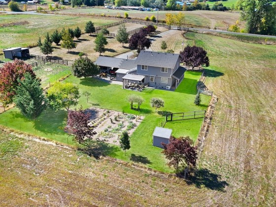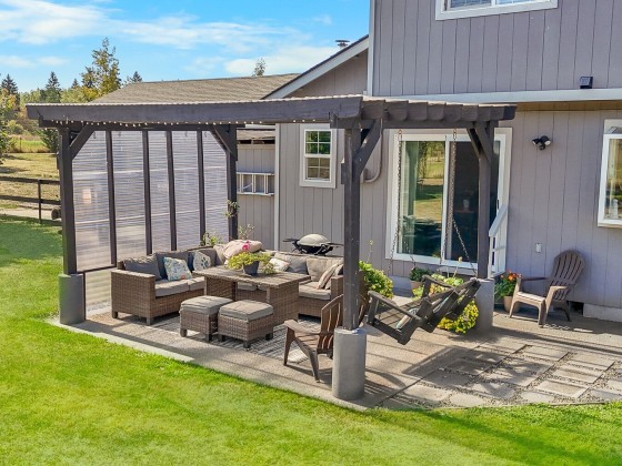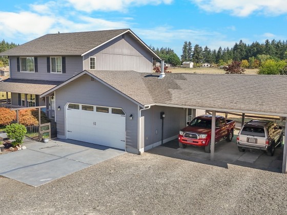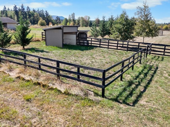 Lovely equestrian property on 5 fenced ac w/luscioius pastures. Animal shelters, open riding arena & view of Mt Rainier. Set far back from road & quiet. Meticulously maintained. Sparkling inside: gleaming laminate floors through most of home. Beautiful granite kitchen counters & breakfast bar, stainless appliances. Quality finishes: white raised panel doors, trim & crown molding. Formal dining/family room. Large laundry room/pantry. Fruit trees. Garden. Sustainable products in garden & orchard. Chicken coop. Attached garage & 2 carports. RV parking. Wiring for hot tub. Shared well w/hand pump. Covered wrap around deck & covered gazebo - perfect for relaxing @ end of day. Newer roof. Electric gate. No HOA. Close to amenities, Olympia & JBLM.