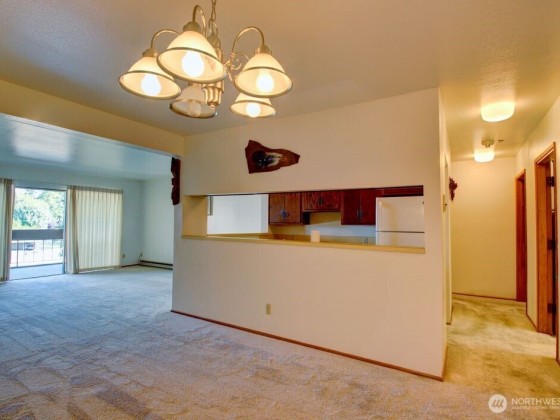 Spacious 2 Bed/2 Bath Condo at Deer Runn Condominiums offers comfort & convenience. End unit on the 3rd floor. Open floor plan w/ large dining & living area complete w/ wood fire place. Sliding glass doors allow the natural light in from vast covered balcony. Thoughtfully designed layout w/galley kitchen, pass-through hallway leads to separate utility room w/ washer & dryer included, & 2nd bedroom lives like 2nd primary w/a in-room door to access the hallway bath. 1 covered & 1 uncovered parking space, private storage, & 2 pets allowed no size limit. Condo dues cover water, sewer, garbage, & common area maintenance. Intercom system to open the always locked/secure lobby door. Close to YMCA, shopping, hospital and easy access to I5.