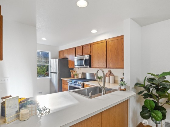 Discover the peaceful atmosphere of this Townhome style condo. Vacant, well-maintained, move-in-ready, just waiting for you to make it your own! Full of natural lighting up + down, end-unit has just 1 shared wall. 7-unit complex situated on a private dead-end lane. Upper floor boasts 2 bedrooms with separate bathrooms, primary has its own. Interior freshly painted. Newer kitchen appliances, with Samsung induction range + oven! Living room opens onto private patio w/ locking storage shed - hangers await your bikes. 5 minutes to Trader Joe’s, just minutes to the unmatched Edmonds waterfront. Walk to schools + Edmonds College. Easy I-5 access, ample parking, cozy neighborhood feel. Inspection provided, well-managed HOA, cats allowed.