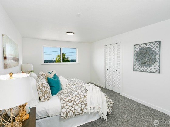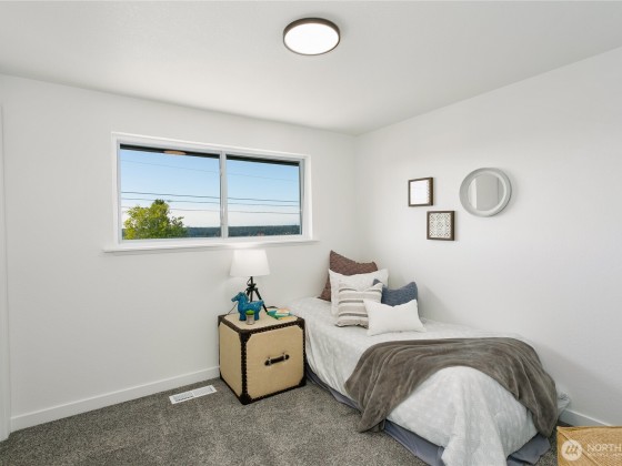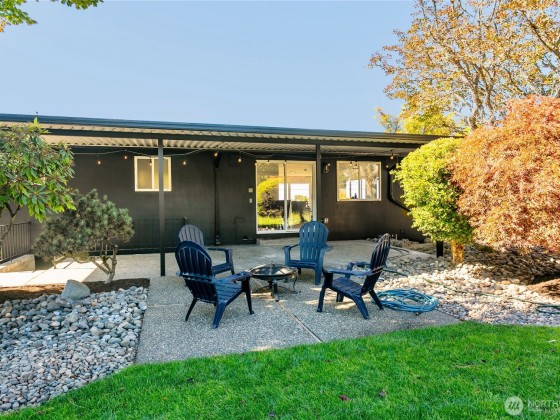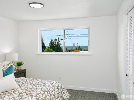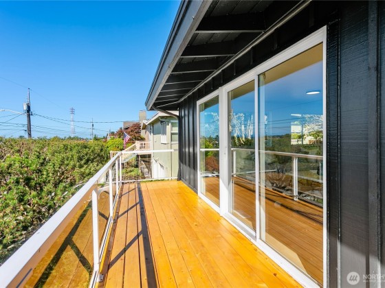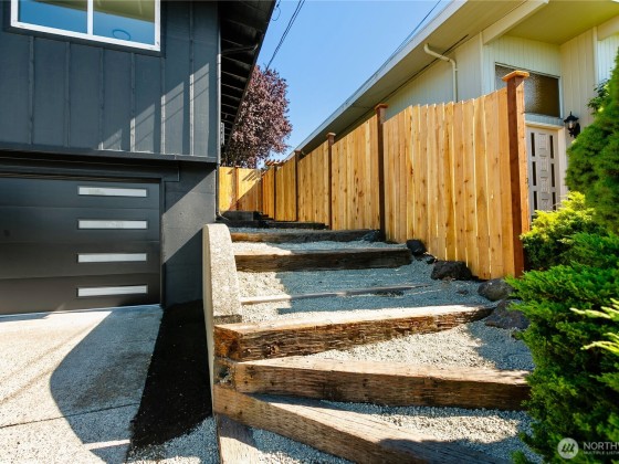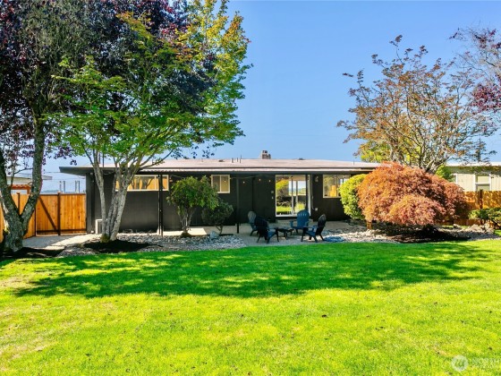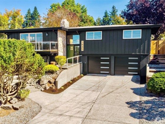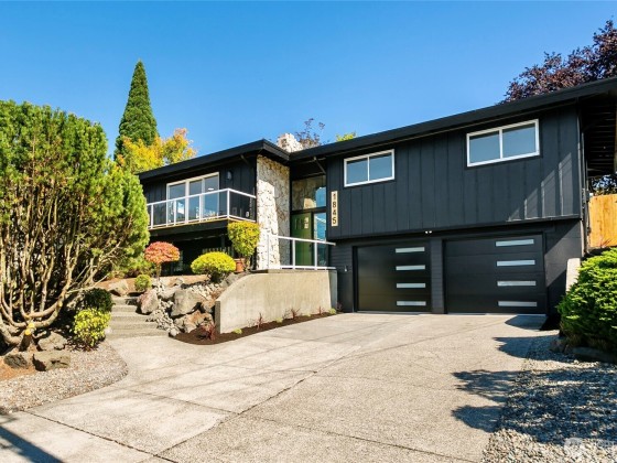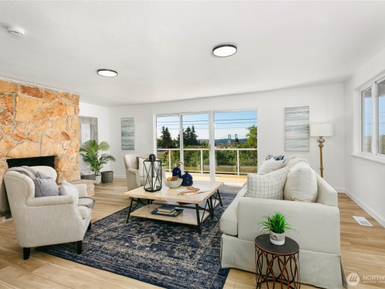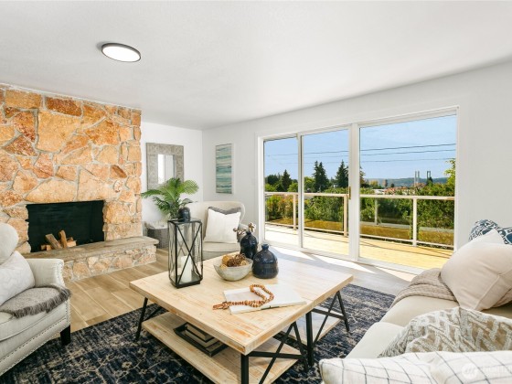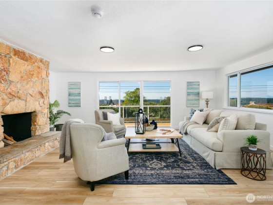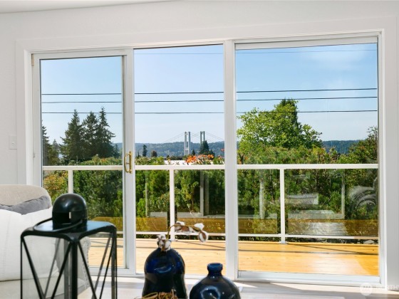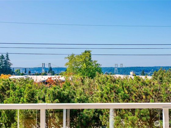 Mid-Century Modern in North Tacoma's Coveted Skyline Neighborhood! Fully updated, turn-key home w/narrows bridge, mountain & sound views throughout! Upstairs you will find the open living area, fireplace w/VIEWS + private patio! The living area is open to the dining area/kitchen with luxury quartz countertops /waterfall kitchen island for gathering. Stainless steel appliances + soft close shaker cabinets! Spacious primary bedroom upstairs w/VIEWS + walk-through closet & en-suite bathroom. Additional bathroom and bedroom upstairs! Downstairs you will find an additional spacious bedroom with fireplace plus 4th bedroom and 3/4 bath! NEW LVP flooring/paint/fixtures! You will LOVE the fully fenced, perfectly manicured yard. 1/4 ACRE Lot. NO HOA