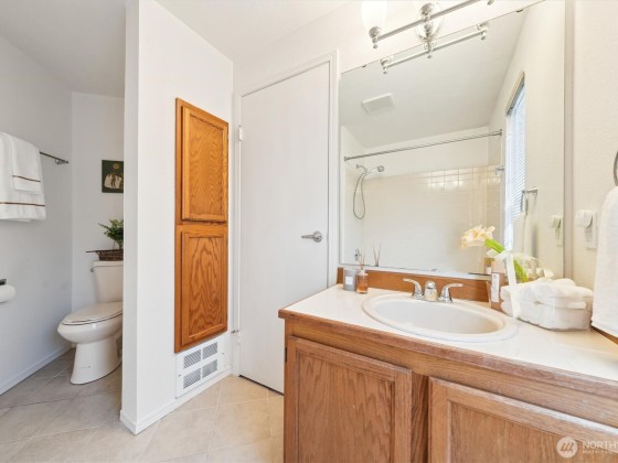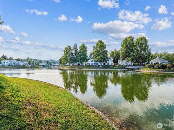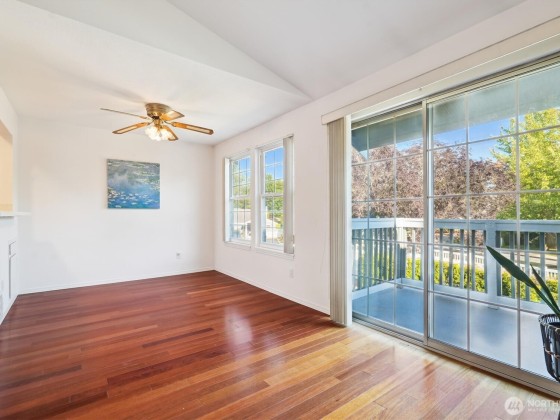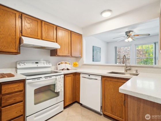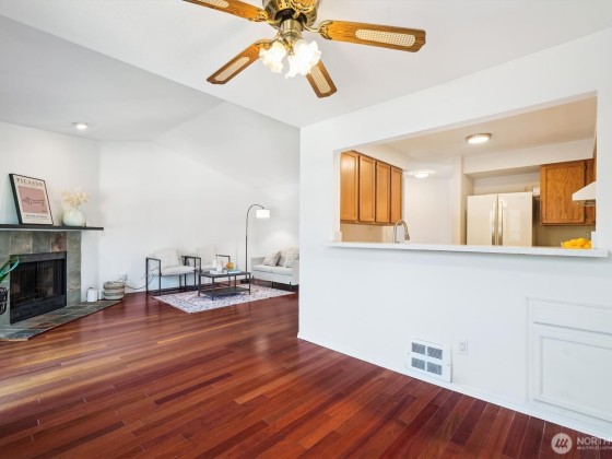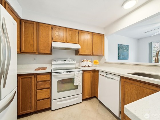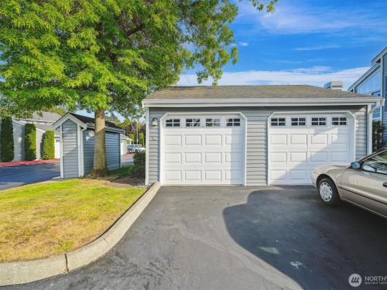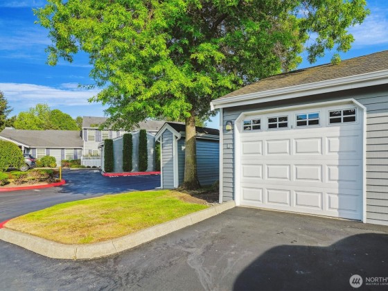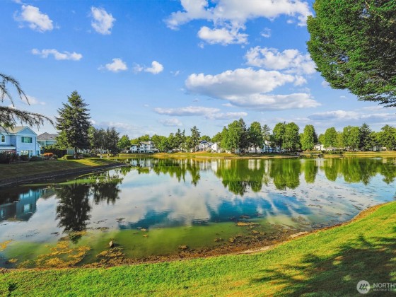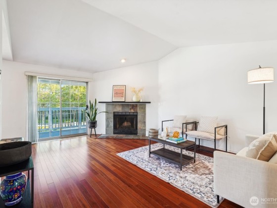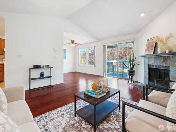 Experience the perfect blend of comfort and convenience in this hard-to-find, one-level condo with 2 beds, 2 baths, and 1,024 sq ft—just steps away from the lake. This bright, inviting home features vaulted ceilings, engineered hardwood and tile flooring, quartz countertops, a farmhouse-style sink, and fresh paint inside and out. Cozy up by the fireplace or relax on your private balcony with outdoor storage. Includes a detached garage plus two uncovered parking spaces. Close to Riverbend Golf Complex, parks, Kent Station, I-5, and SR-167.