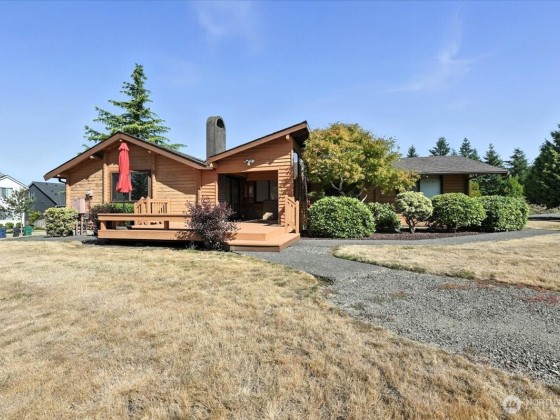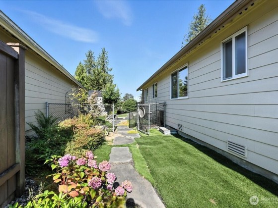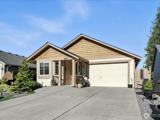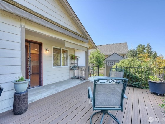 Welcome Home to Birch Creek – a 55+ Community in Marysville! This beautifully updated 1-bedroom plus den rambler offers 1,005 sq ft of comfortable, single-level living. Vaulted ceilings create a spacious and airy feel, nice updates throughout include new flooring, refreshed kitchen and baths, and built-in shelves in the office/den. The large primary features a walk-in closet and bathroom. Enjoy the outdoors in your fully fenced yard with a generous deck and automated awning – perfect for all weathers. Enjoy the the nicely manicured yard. Perfect space for a garden. Only lot that can add another bedroom. Drawings in the supplements. A well-maintained home in a quiet, friendly community!