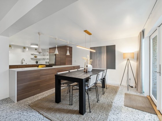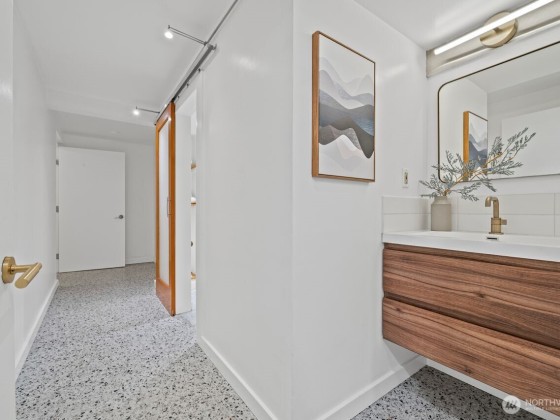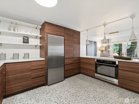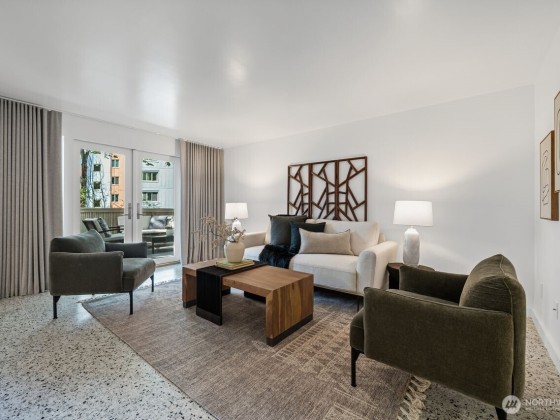 Experience the epitome of mid-century modern city living with this meticulously crafted condo where style and convenience converge. The exquisitely designed kitchen with luxury appliances and bespoke lighting opens up to the dining and living room, accentuated by brilliant white terrazzo floors and natural light. The primary bedroom boasts a custom walk-in closet and ¾ bath while the second bedroom offers WFH opportunity or room for guests experiencing Seattle’s best. Enjoy the dramatic dedicated elevator access via the Union St. entrance or enter via your gated, tree-lined ground-level terrace. Dedicated garage AND driveway parking, amenities, and ample storage. City living at its finest awaits!