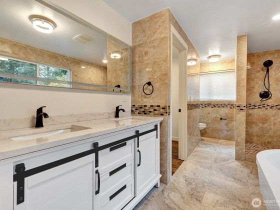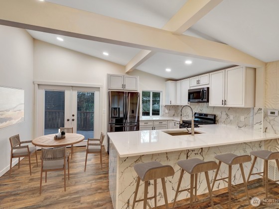 Stunning fully permitted remodel in Kirkland’s desirable Finn Hill! Spacious 4BR/Bonus +2.5BA, 2,392 sq ft home redesigned with modern style & efficient layout. Main floor features brand-new primary suite, open-concept kitchen w/ new appliances, custom lighting, & updated baths. Lower level offers 2 additional bedrooms, full bath, theater room & flexible bonus spaces—perfect for home office, remote work, or multi-gen living. Major upgrades: new siding, deck, flooring, fixtures, washer/dryer, water tank, gas heater, fresh int/ext. paint, fencing & roof repair. Professionally landscaped for low-maintenance curb appeal. Located in Lake Washington School District, close to tech campuses, parks, shopping & commuter routes. Move-in ready!