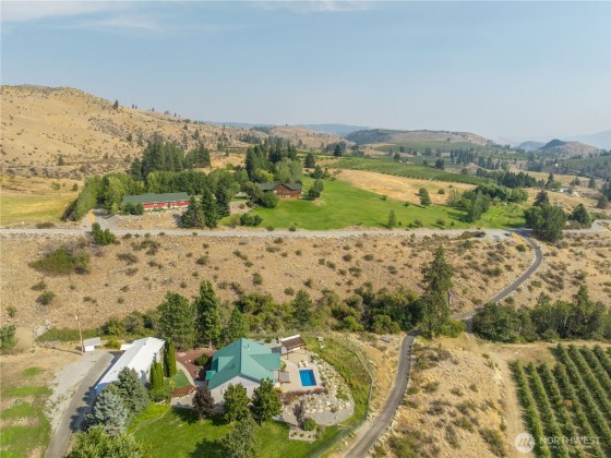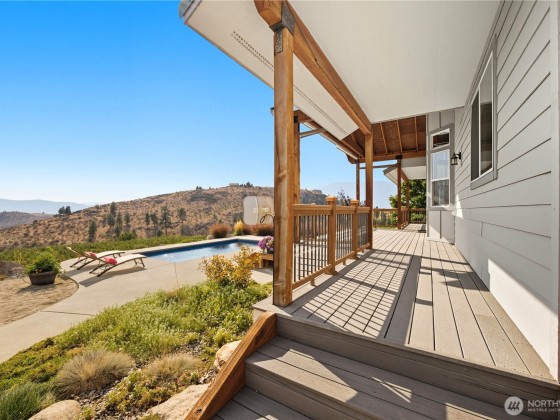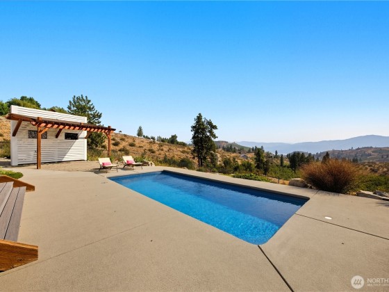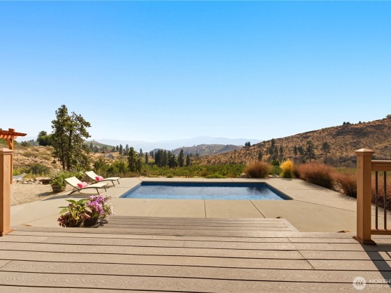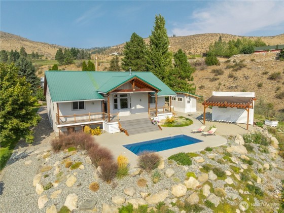Enjoy serene hillside living with stunning views of Lake Chelan and the surrounding mountains! This thoughtfully designed home offers peace and privacy while being just minutes from town, the lake, wineries, and hiking. The open floor plan features vaulted ceilings with reclaimed beams, custom cabinetry, newer carpet, and a spacious primary en-suite. Entertain with ease on the covered deck or beneath the outdoor pergola. The fully fenced yard is complete with raised garden beds, wildflowers, and a cocktail pool. Bonus perks include a 3-car garage and ample crawlspace storage—perfect for full-time living or a relaxing getaway.