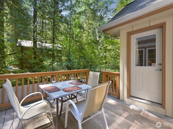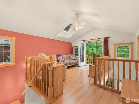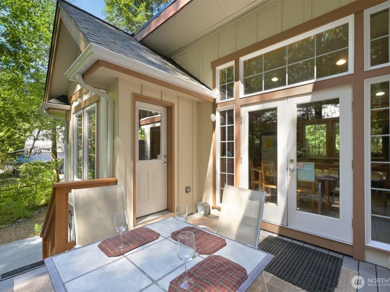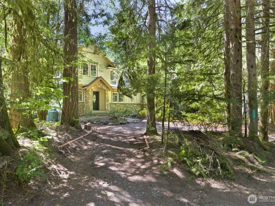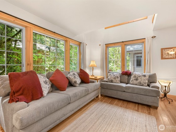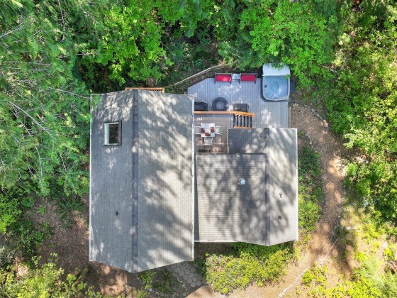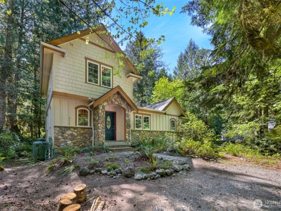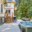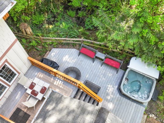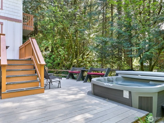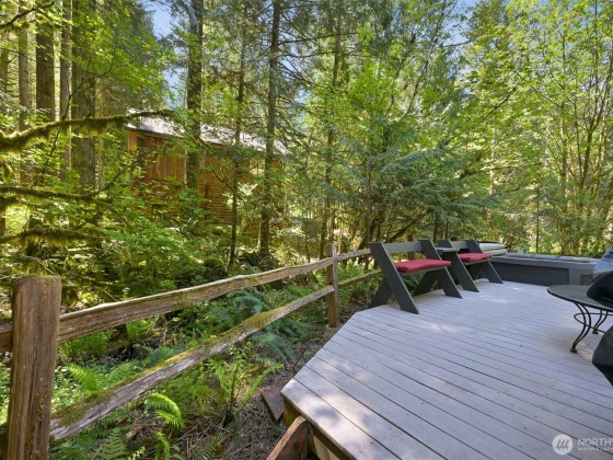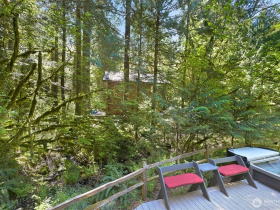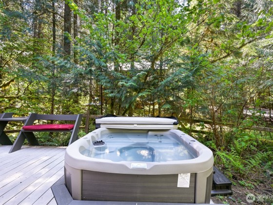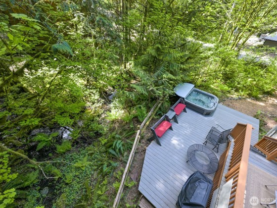 This custom creek side home offers a serene retreat, with the soothing sound of a nearby mini waterfall audible from the brand-new hot tub when the jets are off. Surrounded by a native protection area, the U-shaped design by local firm JWR Design ensures privacy from roads and neighbors. Swing open the French doors from the kitchen to hang out on the deck or pop open the door from the primary bedroom to enjoy the sound of water. The upstairs features a loft with a mossy view deck and a second bedroom with ensuite bath. The expansive lower level includes a bonus, rec room, and added sleeping area with new luxury vinyl plank flooring and carpet.