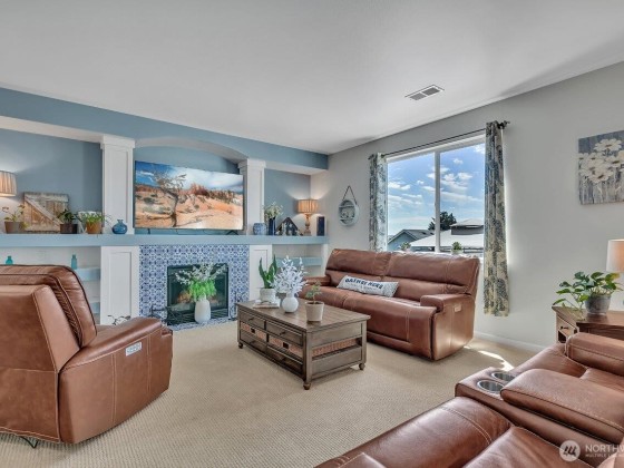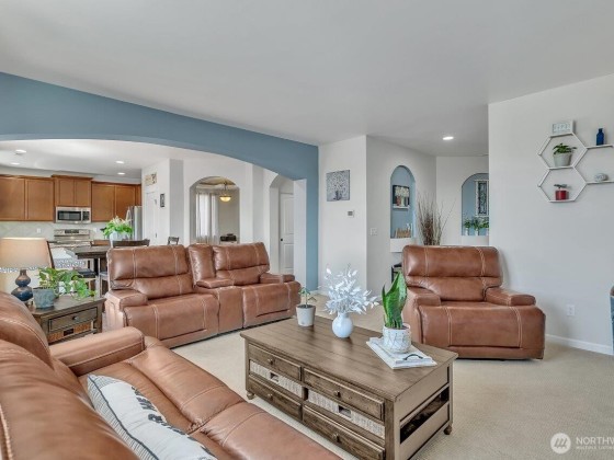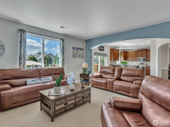 Welcome home! 2,508 square feet of comfortable living space, featuring 4 spacious bedrooms, a versatile loft/bonus room, and an open-concept kitchen complete w/eating bar, nook, & a pantry. Updates include brand new carpet & the added comfort of AC. Primary suite boasts a large walk-in closet & a luxurious 5-piece bath. Don't miss the rare 4-car garage! Throughout the home, you'll find thoughtful custom details such as built-in entertainment & media centers, elegant art niches, decorative arches, coffered ceilings, and accent lighting above the kitchen cabinets, dining & primary, creating a warm and inviting ambiance. Enjoy convenient access to HWY 167, Sounder Transit Center, schools, shopping, walking trails, & the Lakeland Town Center.
