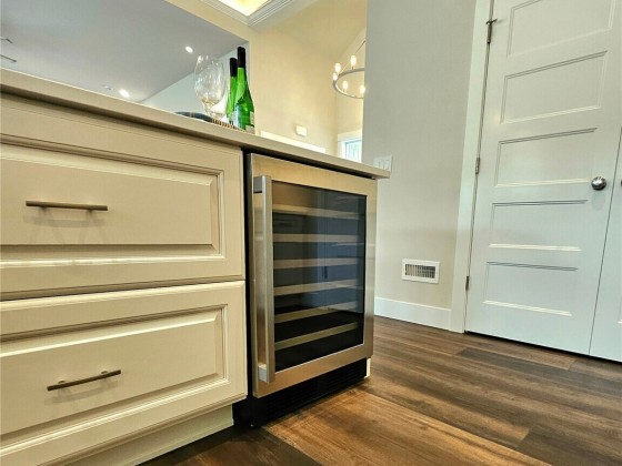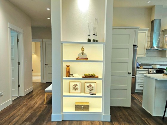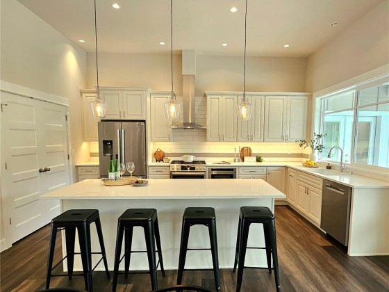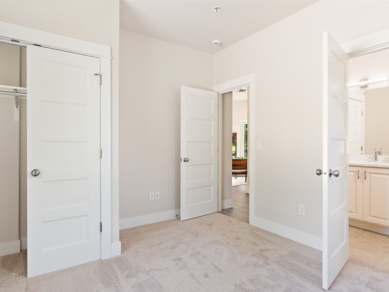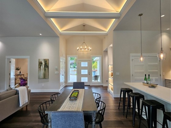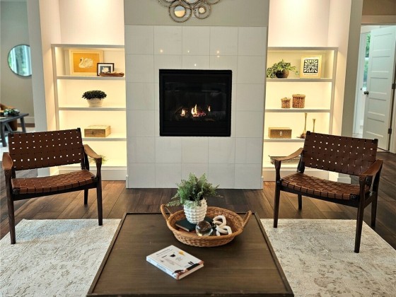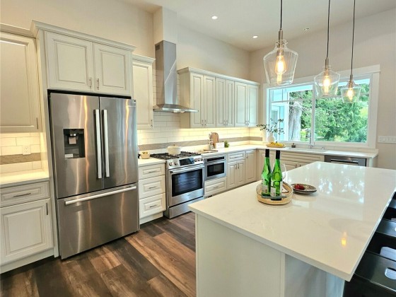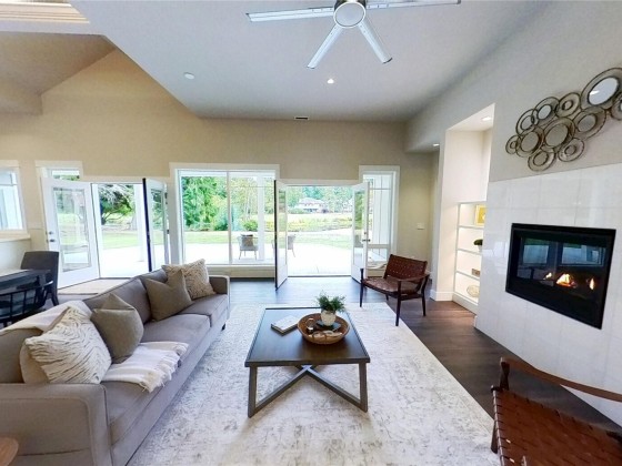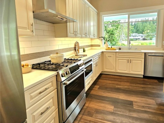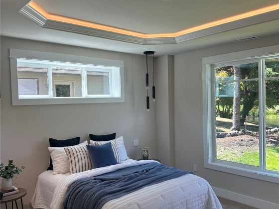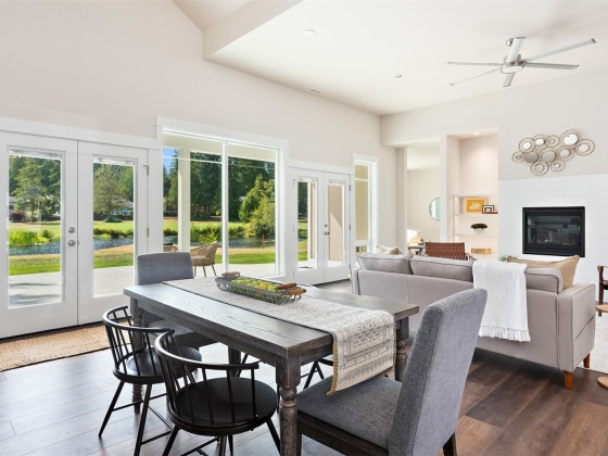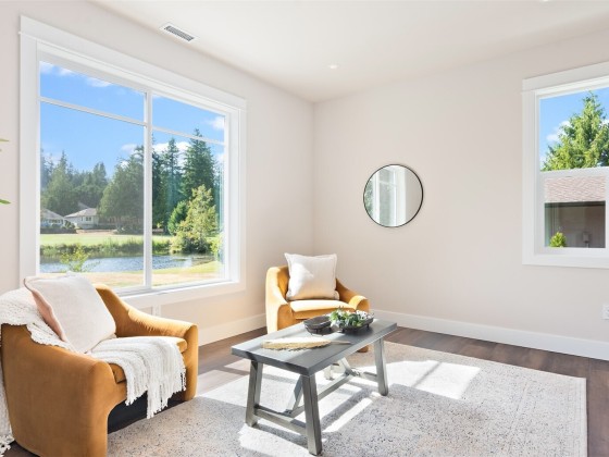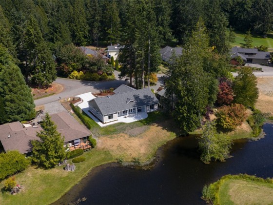 Step into elegance with this no bank waterfront to a beautiful pond & golf course. Enjoy the patio and lawn in this peaceful waterfront setting. Accents of French Renaissance in this 3 bedroom 2.25 bath waterfront home with ornate vaulted ceilings and French doors to the patio from both the living room and primary bedroom. Gourmet kitchen with all Bosch appliances. Gas range with electric oven. Contemporary LED lighting throughout the home. Touchless faucets, heated towel rack, Wine chiller, linen closet, pine soffits, gas Range with electric oven, radiant floor heat in bathroom, hardi shingles, propane fireplace, wired for EV & generator.