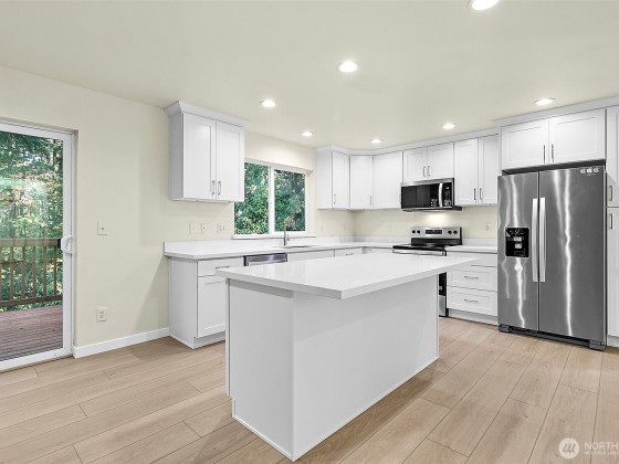 Beautifully remodeled home in Tukwila! Featuring brand new wide LVP flooring, carpet, deck, custom kitchen cabinets with white quartz countertops, a large island with brand-new appliances including dishwasher, range, and microwave. Fresh interior paint adds a move-in ready touch. Rare 3-car garage w/storage plus ample outdoor parking, perfect for multiple vehicles or RVs. Enjoy serene greenbelt views from the backyard for privacy and relaxation. A great investment property for short-term rental (No HOA). Conveniently located with easy freeway access and just minutes from SeaTac International Airport, Tukwila International Boulevard light rail station, Southcenter Mall, shopping, dining, entertainment are all within reach. Pre-inspected!