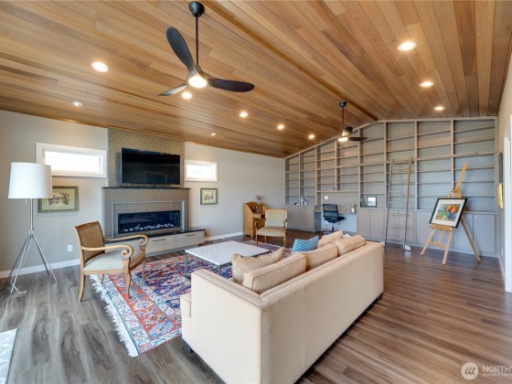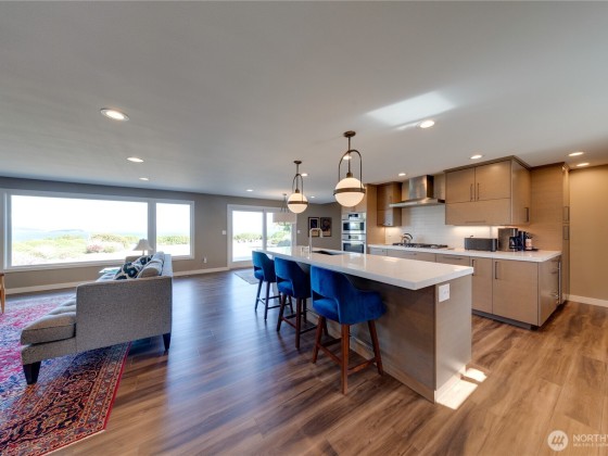 Take in the views of Saratoga Passage in this classic Northwest home extensively remodeled in 2021 with a new great room, workshop, and garage addition. The chef's kitchen features double ovens, wine refrigerator, and island bar seating, and flows into the living room—all showcasing stunning sound views. The open floor plan allows ample space for entertaining, while a separate living area offers a second fireplace and built-in bookshelves with custom sliding library ladder. Throughout the home, find features such as custom solid-wood cabinetry, heated towel bars, and cedar closets. Outside, landscaped grounds with paved walkways, seating areas, and deck offer a place to enjoy panoramic vistas of the Cascade Mountains and Puget Sound.