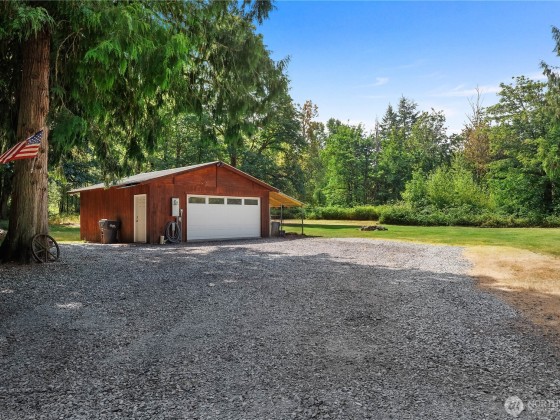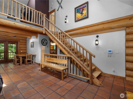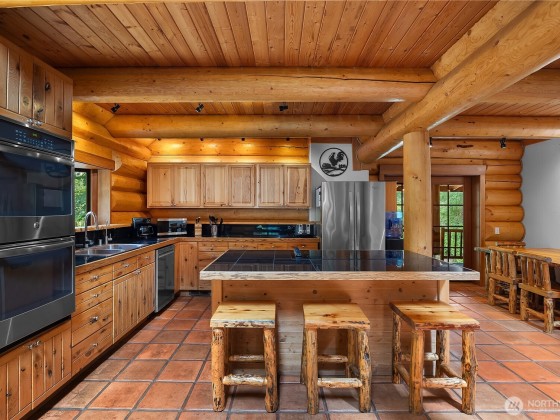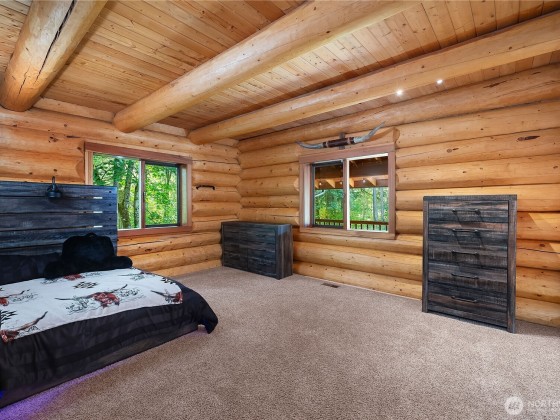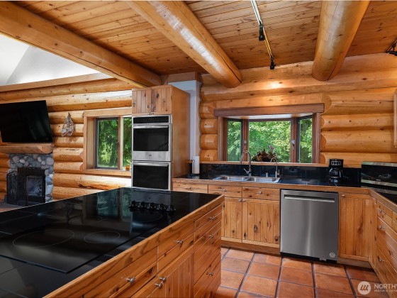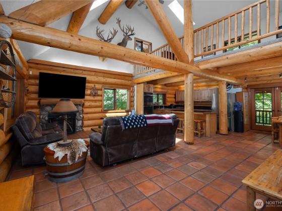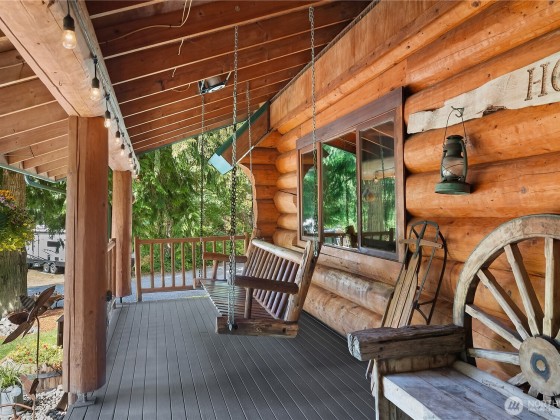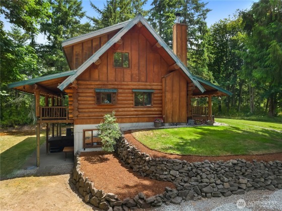 A captivating 3544 sq ft log home offering rustic charm and modern luxury. This Pacific NW retreat provides a privately gated and secluded 10+ acres. The multi-level functional design has 3 bedrooms, a den & 3 bathrooms. Large windows and skylights invite natural light and offer breathtaking views of the surrounding landscape. The gourmet kitchen boasts custom wood cabinetry, high-end appliances, and stunning countertops. A focal point of the living area is the stone fireplace, perfect for cozy nights and gatherings. The primary suite is a private sanctuary, complete with spa-like bathroom, walk-in closet, and dedicated balcony. Multiple viewing decks and patio with hot tub for outdoor enjoyment. Bonus: Oversized garage with shop.