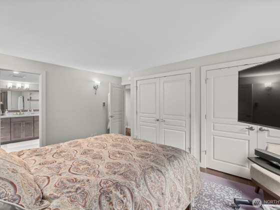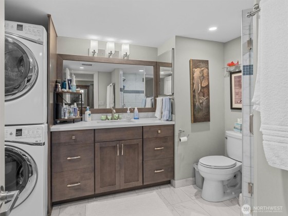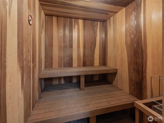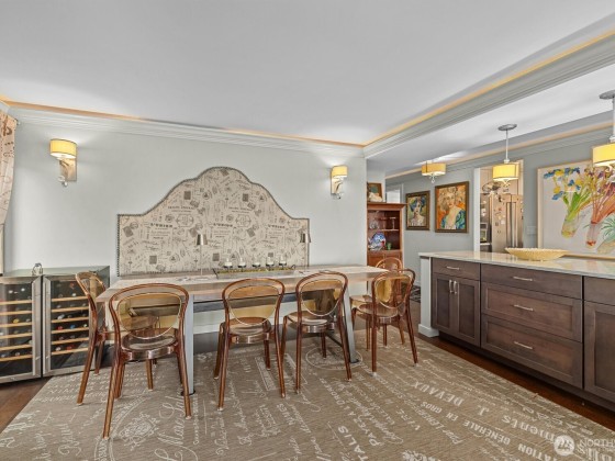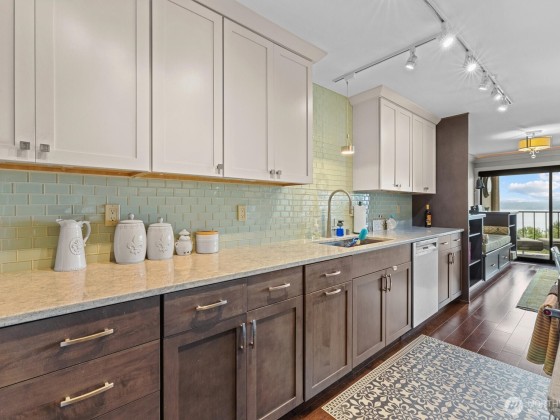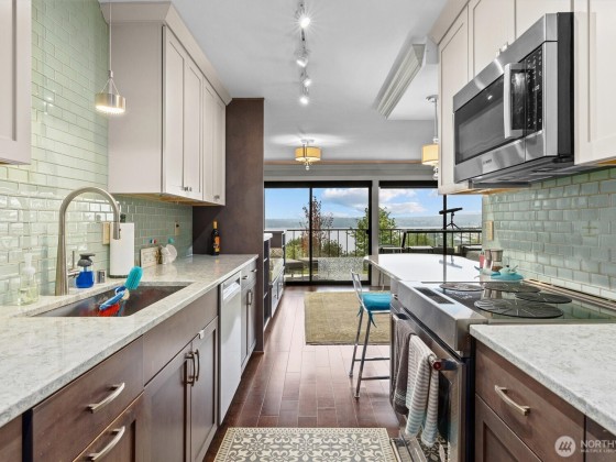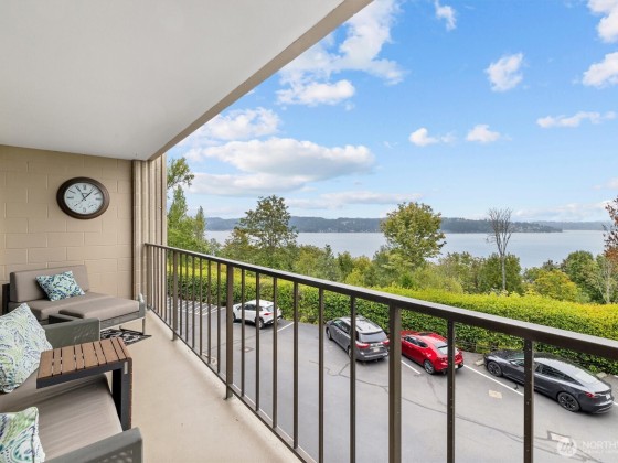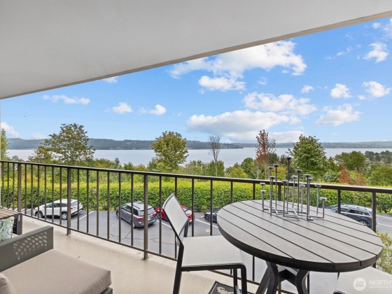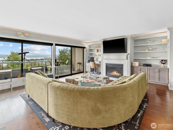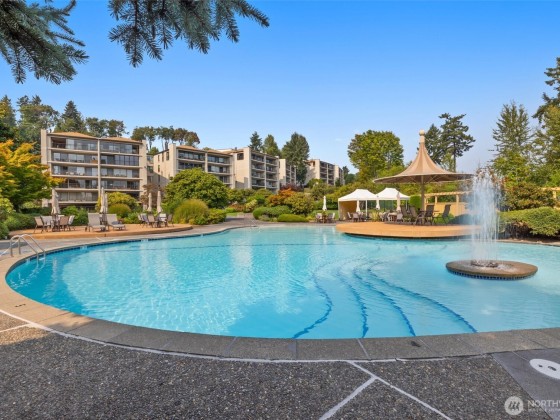 This beautifully renovated corner unit offers one-level living with stunning Lake Washington and Cascade Mountain views. The spacious interior features a lavish living room with floor-to-ceiling windows framing the lake, with a cozy fireplace and high-end lighting throughout, creating an inviting space perfect for dining and entertaining. The modern kitchen boasts sleek quartz countertops, stylish backsplash, complemented by a unique crystal bar that overlooks the large covered deck. Enjoy access to an executive gym, a spa-like swimming pool with a fountain, a sauna, electric car charger, access to the Burke Gilman Trail, and the Sand Point Country Club with driving range and tennis courts, all set within a beautifully manicured community.