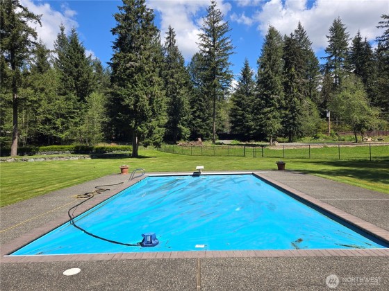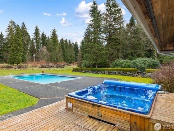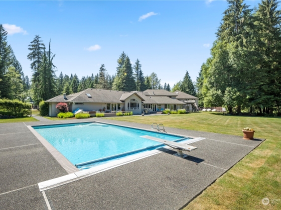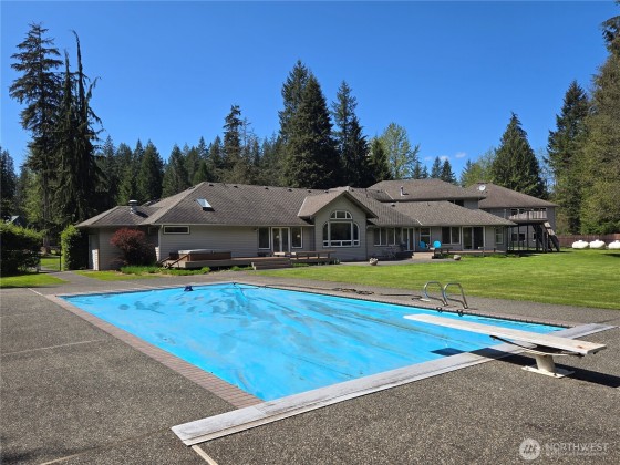 THIS home offers a wealth of amenities. Fully fenced, fully private acreage and the grounds are flat and usable. The home offers privacy and large, spacious rooms. Capturing that special/appreciated PNW natural light is automatic with the skylights and BIG windows this home enjoys. Each season has its own splendor and this home takes advantage of all, but late Spring and Summer is enhanced by an in-ground pool, a hot tub, massive patio spaces, an elevated deck and French doors/sliders that access those spaces. Upstairs, in the main home, offers HUGE rooms w/a full bar, game/great room and deck. The attached ADU offers a multitude of options, as does the detached, heated, insulated, 4k sq ft shop w/a bathroom and laundry. Incredible home !