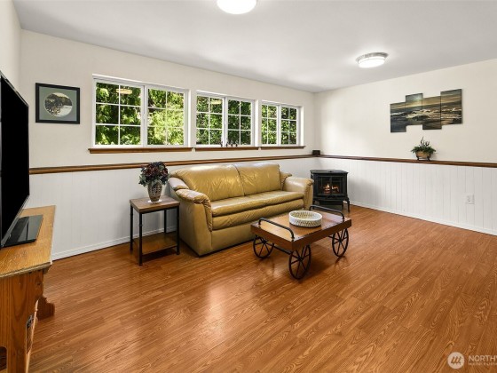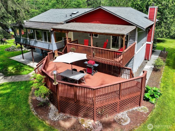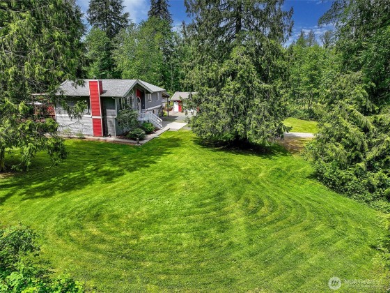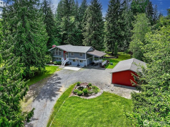 Amazing Arlington oasis with unparalleled privacy! This NW contemporary home is settled on nearly 4 acres with a huge 3 car permitted shop/garage! Cedar vaulted ceilings throughout great room. Updated open kitchen boasts newer cabinets, appliances & beautiful island with an abundance of storage. Upstairs features two bathrooms & three bedrooms, including the primary with a solarium off the suite. Lower level outfitted with full kitchen, bedroom, office & laundry room with a 3/4 bath. The large family room is ready for your vision. Detached sunny craft room, former barn for storage & additional covered parking for boat or RV! Stunning yard with gazebo perfect for hosting. Don’t miss out on this serene setting in a convenient location!