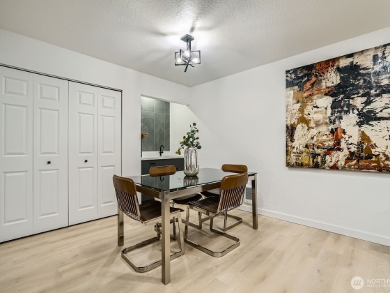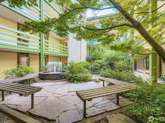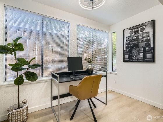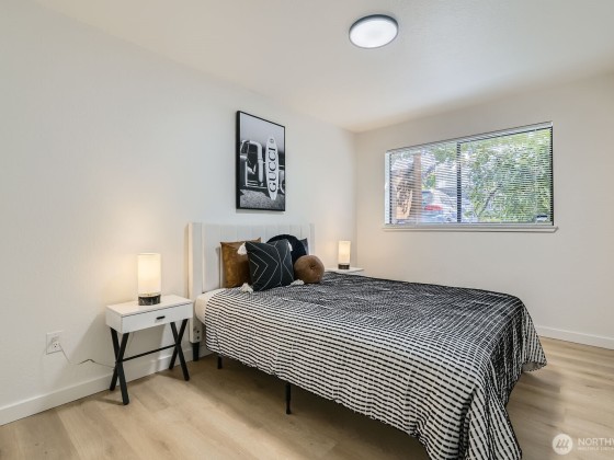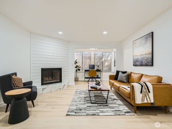 Fully renovated corner unit on ground floor, located near Northgate’s best amenities. Modern kitchen features matte black flat-panel cabinets, quartz countertops, stainless appliances, and overlooks a private courtyard with a tranquil fountain, perfect for morning coffee or evening unwinding. Spacious layout includes wet bar, versatile bonus space ideal for home office, gym, reading nook, or creative studio, and a primary suite with dual closets. Bathroom showcases Tulum-style tile and frameless glass shower. Waterproof, scratch-resistant LVP flooring runs throughout. Every detail upgraded, new doors, trim, lighting, and a wood fireplace accent wall. Dedicated parking and no rental cap. Minutes to Light Rail, I-5, shopping, dining and more.