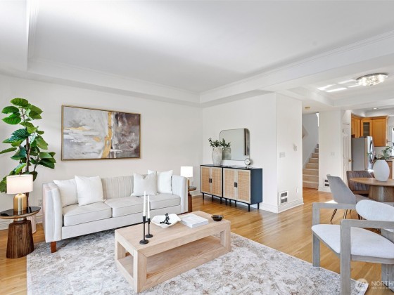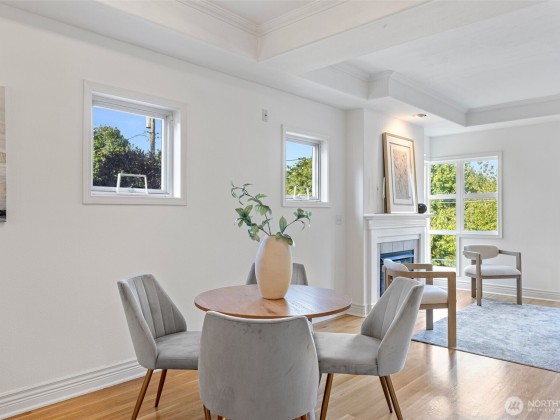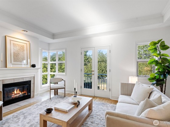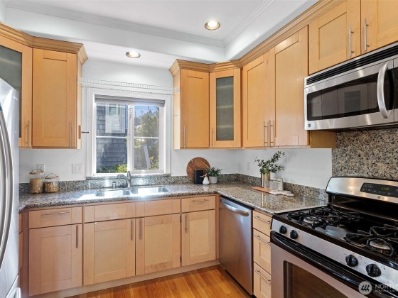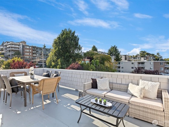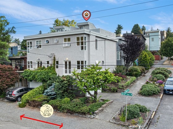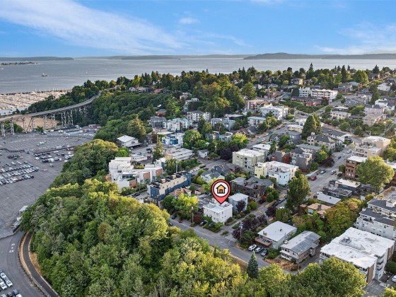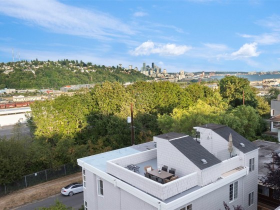 This beautiful Magnolia townhome has what many do not - two living areas and two outdoor spaces, offering nice flexibility. Garden patio creates welcoming entry, while wet bar at top of stairs adjacent to the rooftop deck makes entertaining easy. Just one wall connects to the neighbor and is situated on a quiet corner lot w/ green space and walk path across the street provide lush views. Inside, oak hardwoods adorn the main floor. Kitchen has granite counters with bar that seats two, ss appliances and a new dishwasher. Sweet Juliette balcony and gas fireplace add character. Primary bed has 5-piece en-suite bath. Fresh exterior paint. 1+ car garage. Easy access to Magnolia Village, Downtown Seattle, Parks & Ballard. No HOA or sewer capacity.