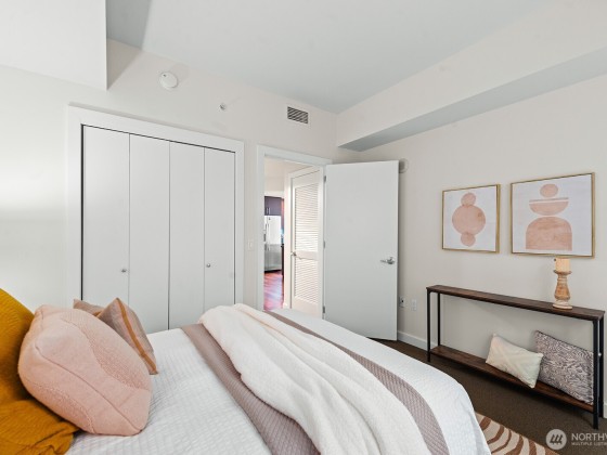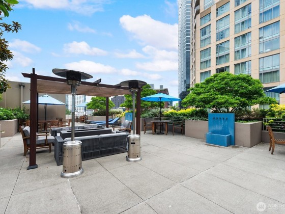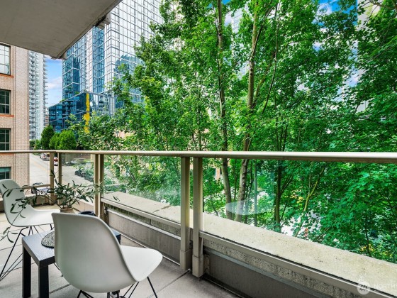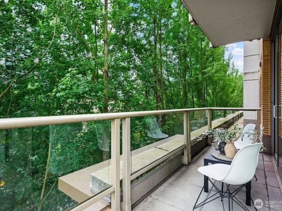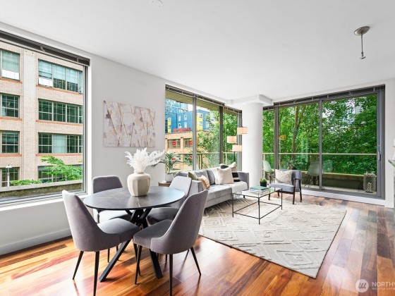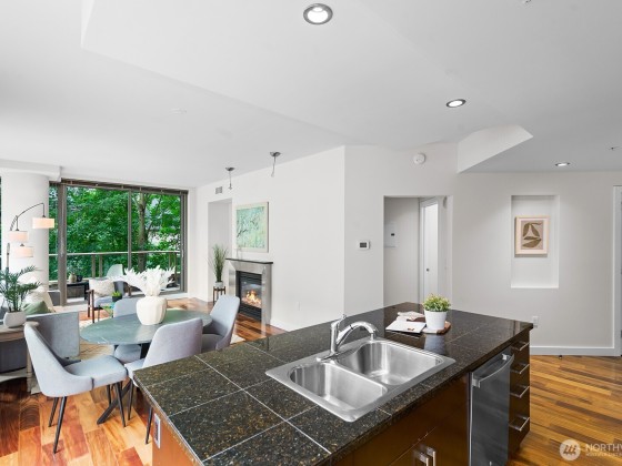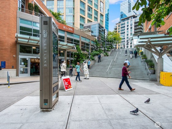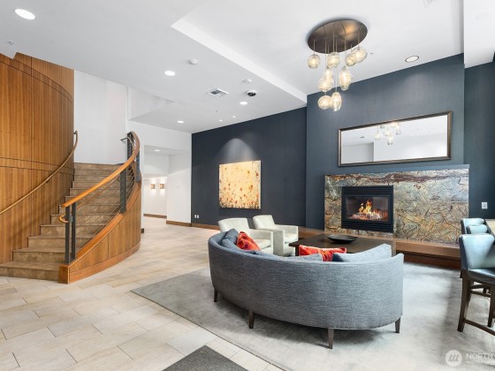 Modern Contemporary retreat in the heart of South Lake Union! This SE corner with a tree lined street at 2200 Westlake offers floor-to-ceiling windows, gas fireplace, hardwood floors, and a private balcony with streetscape views. The island kitchen features granite countertops, stainless appliances, and ample storage. Spacious bedroom with plush carpet and large closet. In-unit W/D, built-in desk, storage unit, and 1 garage space. Enjoy top-tier amenities: gym, sauna, theater, BBQ terrace, Pet area, concierge, and more. Whole Foods just an elevator ride away—urban living at its best!