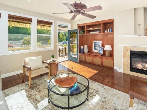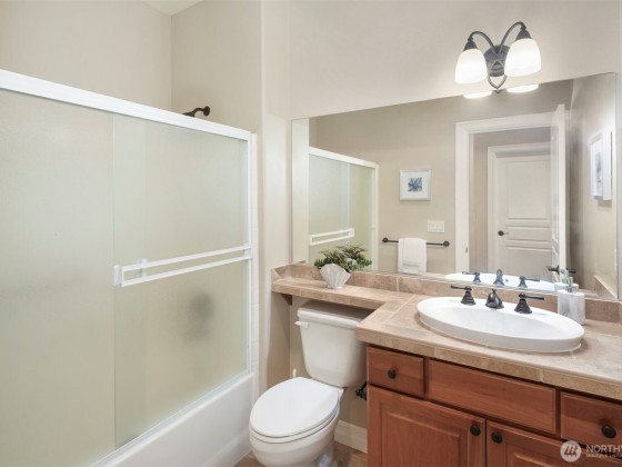 West-facing “Sammamish Plan” with tranquil forest outlook and abundant natural light. Open living, kitchen, and dining areas feature hardwood floors and open to a deck with electric awning for year-round enjoyment. Gourmet kitchen boasts GE Monogram appliances, slab granite counters, pantry, and ample storage. Primary suite includes dual vanities, walk-in closet, step-in shower, water closet, and linen storage. Flexible den/office near entry, guest bedroom, and full bath lead to a laundry with sink and cabinets plus a two-car garage with built-in storage. Air conditioning and pre-inspection complete the package. Age-restricted: one resident must be 53+.