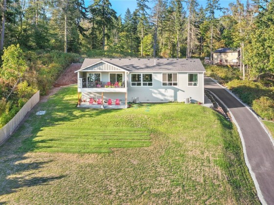 Luxury meets serene coastal living in this exceptional retreat with stunning water views and rare privacy. Floor-to-ceiling windows wash the open living areas in natural light, centering on a striking fireplace framed by custom built-ins. Entertain year-round on the expansive covered patio with its own fireplace, or unwind in oversized bedrooms designed for comfort. A dedicated office features bespoke cabinetry, while super-efficient heating and cooling ensure ease of living. Southern exposure from the quiet east side of the island enhances the exposure, and thoughtful details like leaf guard gutters provide lasting low-maintenance convenience.