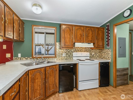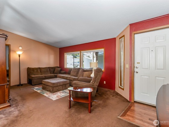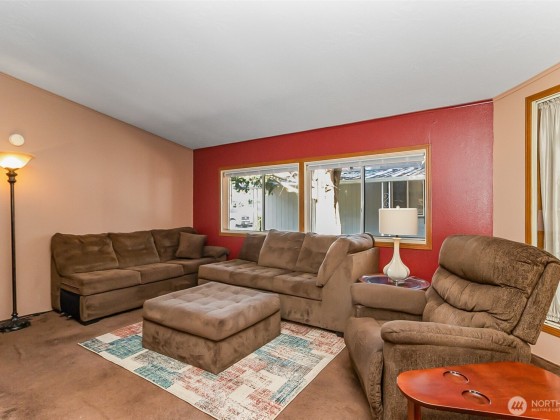 Extra large home in an all-age park. Nearly 1800 square feet with hard-to-find four bedrooms. Spacious bedrooms with an ensuite bath off primary bedroom. Enjoy a quiet small town feel while only being minutes from services, I-5 and I-405. Park amenities include clubhouse and ball field. Home backs on a green belt from Airport Park. Also near Martha Lake. Shed in back for extra storage. Welcome Home!