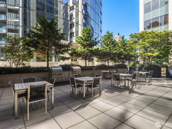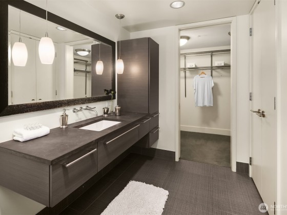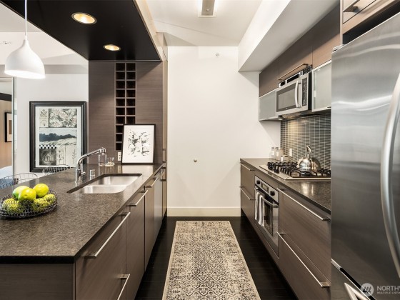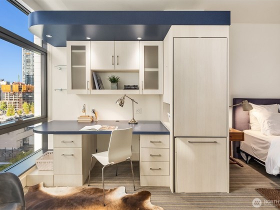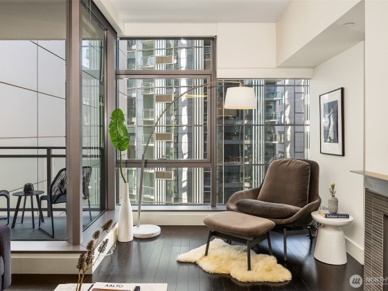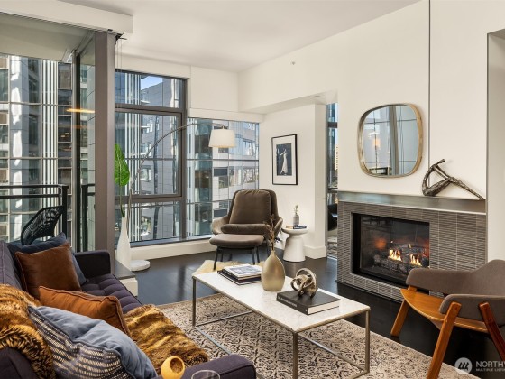 Welcome to Enso, A LEED certified building in the heart of bustling South Lake Union. Largest one bedroom floorplan in the building with just under 1,000 Sq ft. This unit features walls of windows, extensive custom built ins, a duel sided living room/bedroom gas fireplace, central AC and a covered deck. The large primary suite features a high end built in office nook .Spa like bath with huge soaking tub, large walk in closet and a kitchen featuring high end appliances, plus a powder room off the entry. Garage parking and storage unit included. This building exudes quality and is excellently managed and maintained. Building features include gym, party room, guest suite, and shared entertainment deck. Prime location, truly the place to be!