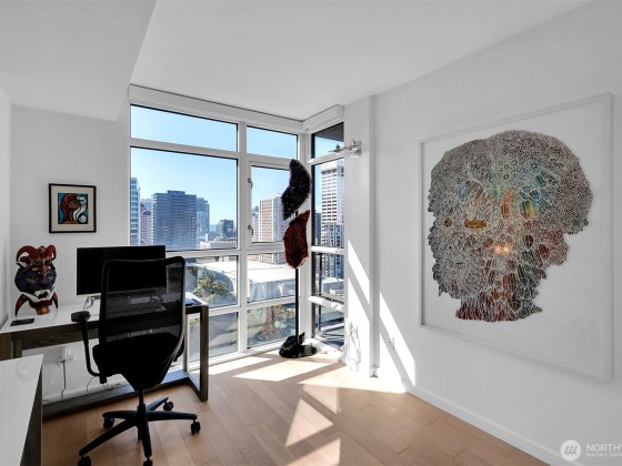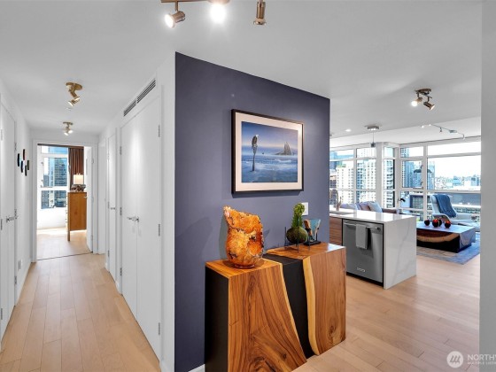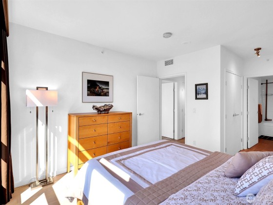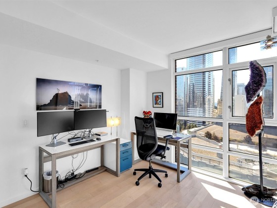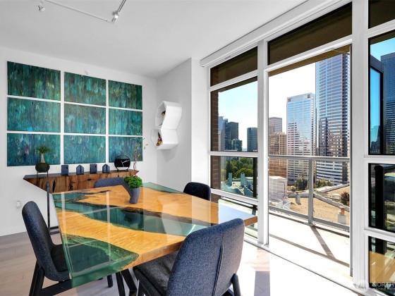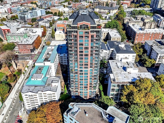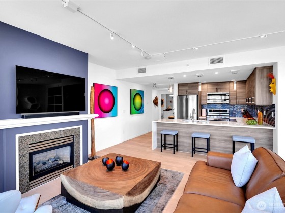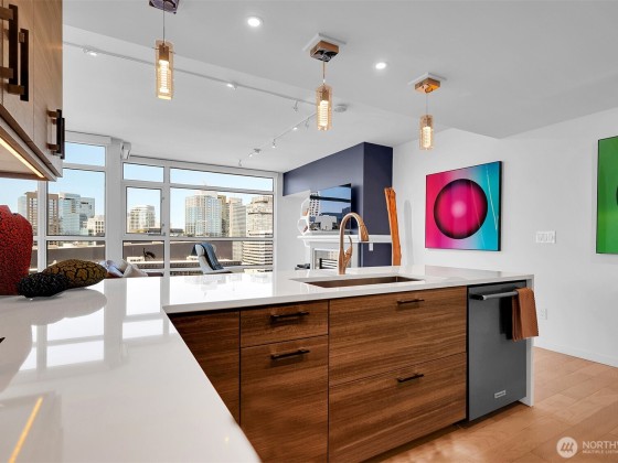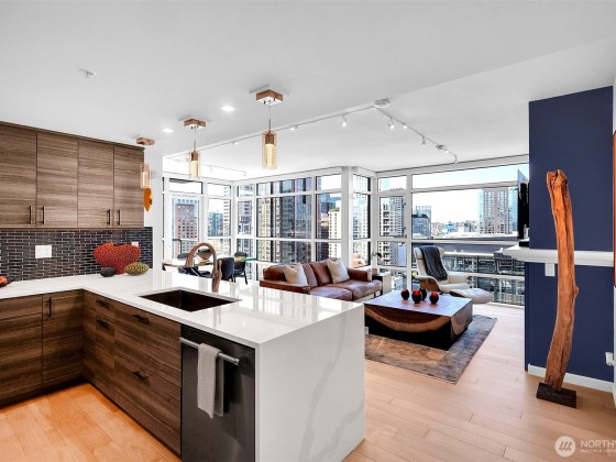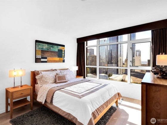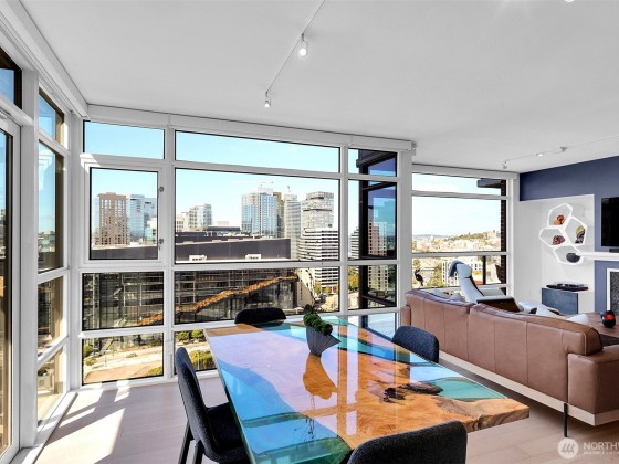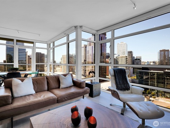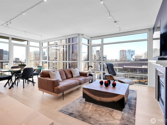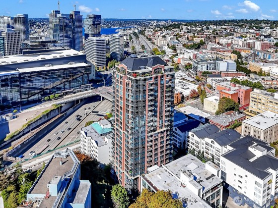 Magnificent NW-facing corner unit, features stunning, unobstructed views of downtown, Lake Union, and beyond! Masterful layout includes floor-to-ceiling windows with NEW RC power blinds. Entirely NEW & updated kitchen (2020). NEW lighting & hardwoods throughout (2020). NEW HVAC system (2025). Fresh paint, gas stove & fireplace. 2 comfy bedrooms, 2 large baths (primary en-suite & walk-in closet). Lots of storage in-unit, plus two large storage units in the garage. Residents enjoy amenities such as full spa, gym, theater, & 24hr concierge for security. Guest suite also available. Includes 2 parking spaces, and guest parking. Walk to Light Rail, Pike Place Market, shopping, restaurants, and much more! Furniture/artwork available for purchase.