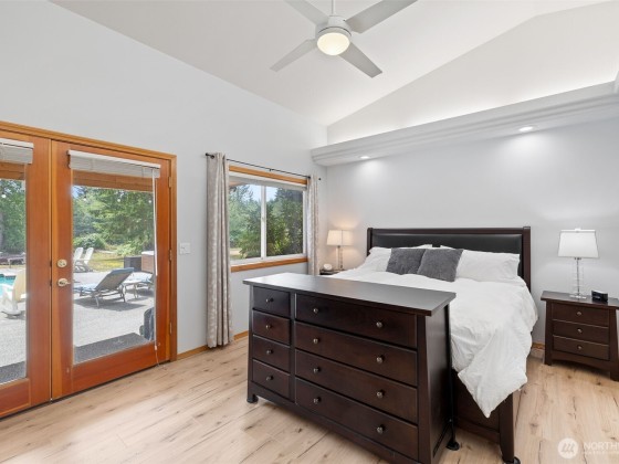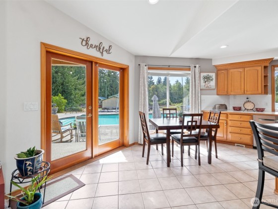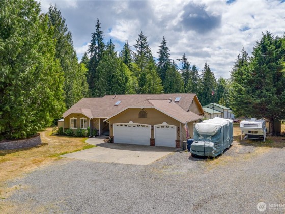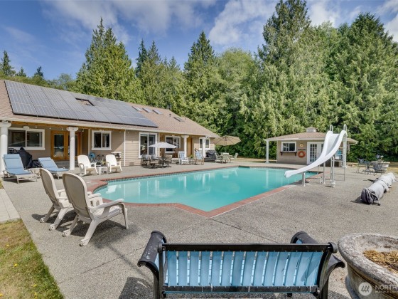 Beautiful Rambler on 4.78 acres with huge shop and in-ground pool! Great room floor plan open to kitchen w/ eating area. Vaulted ceilings with skylights, gas fireplace and lots of windows to enjoy view of pool area acreage and shop. 2 Primary suites with en-suite bathrooms. All bedrms are large w/walk in closets. Both Primary bedrms have access to the pool area. Pool house w/.75 bath & outdoor shower. Solar panels provide 9800 kw to the home. Gas heat pump AC. Home has full house generator 17KW & whole house water purification system. All pool equipment & Hot Tub stay. 3 car garage attached, huge 4 bay shop w/upper rooms, covered RV parking & lots of additional parking. NO HOA! Private setting w/long driveway. Great home for entertaining!