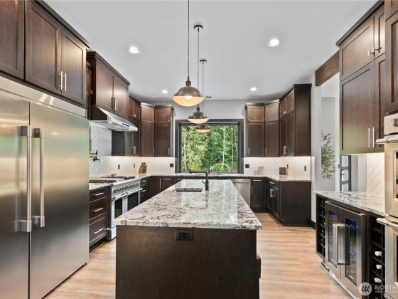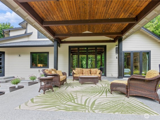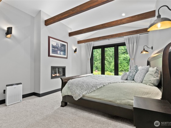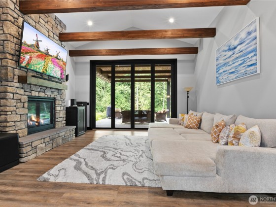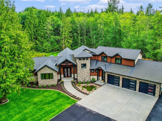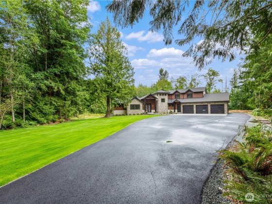 Exquisite custom home on 4+ private acres near Lake Goodwin, showcasing exceptional craftsmanship and luxury finishes throughout. Enjoy vaulted ceilings with exposed beams, dimmable LED lighting, custom steel and rain glass doors, and three stone fireplaces. The chef’s kitchen features four ovens, commercial-grade appliances, a wine fridge, and generous storage. The main-floor primary suite offers a cozy fireplace, sitting area, and spa-like bath with a smart shower and soaking tub. Seamless indoor-outdoor living with 10’ panoramic doors leading to a covered patio, fire pit, and custom paver walkways. The property includes an RV hookup and is wired for a future shop—an elegant and private retreat designed for comfort and entertaining.