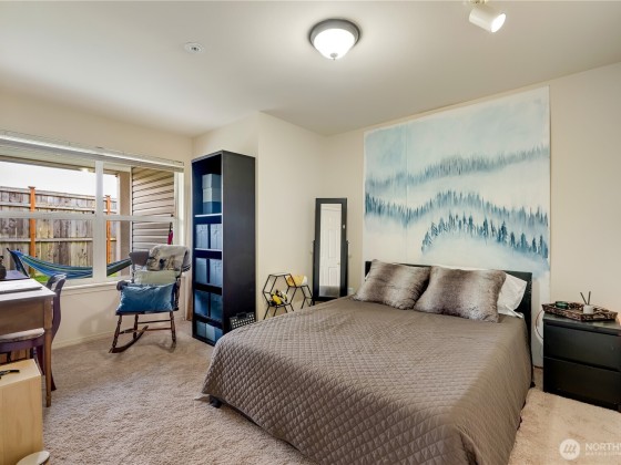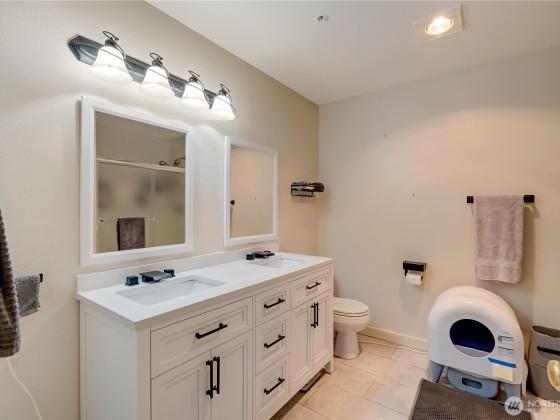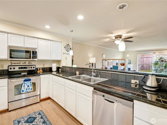 Coveted Silver Lake Ground Level, Single Story Condo in Shoreside Condominiums across from Hauge Homestead Park & Silver Lake w/attached garage, as well as additional assigned parking space. This spacious open floorplan boasts a generous kitchen, granite tile counters, & all SS appliances remain; living & dining room opens to a large walk-out patio; 2bedrooms; Primary offers his/her closets (walk-in) & updated, oversized bath. French doors open to second bedroom; or use as office/den/media room; & convenient in-unit laundry room. New flooring throughout. Conveniently located near shopping, entertainment & services with easy access to I-5, Microsoft Connector stop and nearby Park & Ride. Roof/Gutters replaced 2020; Fence 2021.
