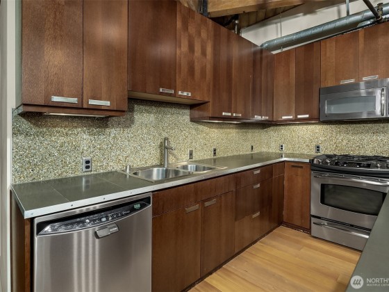 Incredible loft-style condo that seamlessly blends striking industrial elements with modern urban comforts. Located in the heart of vibrant Capitol Hill, home offers an open-concept layout that is spacious + functional. Soaring ceilings, reclaimed Douglas fir hardwoods, exposed brick/concrete walls + old-growth timber beams are some of the stunning design features. Stainless-steel appliances, gas cooktop + custom riff-cut oak cabinetry are kitchen highlights. In-unit washer/dryer + great storage add everyday ease. Two terraces expand opportunities for enjoying outdoors. Rooftop deck offers incredible skyline views. Stroll to restaurants + coffee shops in highly walkable Pike/Pine Triangle.