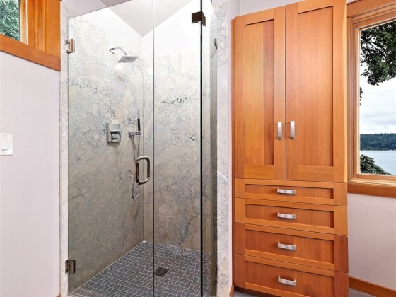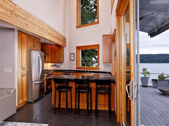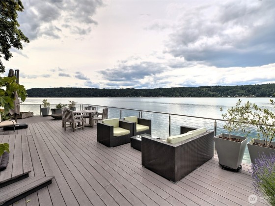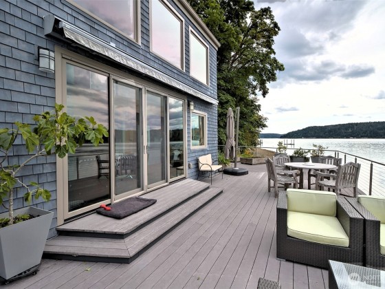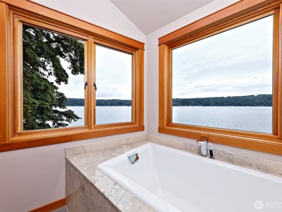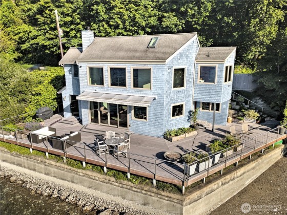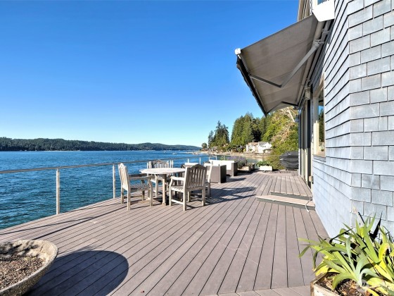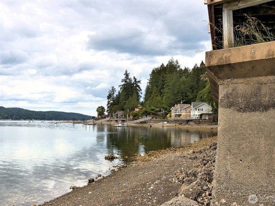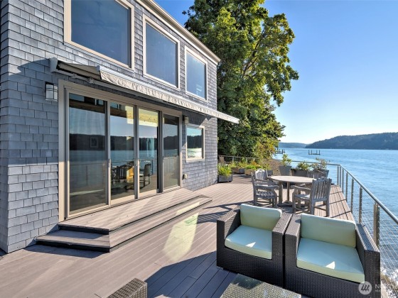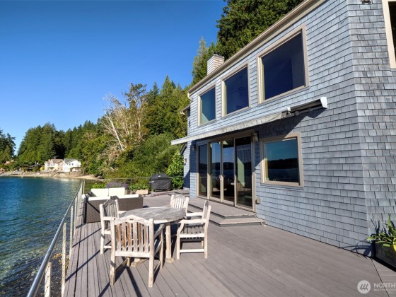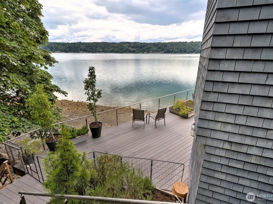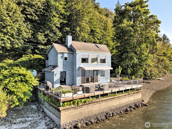 A fabulous South Shore escape! Literally no neighbors for more than 350' on either side. Done with the highest level of style, this beautiful 2 bedroom 2 bath beach house was built right on the beach! Every finishing touch is 1st class. Soapstone countertops, VG fir cabinetry/doors, Wolf dual fuel range, heated porcelain tile floors on both levels, huge soaking tub with a view of the Canal, marble showers, mosaic floor, marble countertops, one of the coolest bathroom sinks ever & an oak floor in the primary. The loft is right off the primary bedroom & overlooks the lower level & out the wall of windows. Skylights that open. Power awning & over 1400 sq. ft. of decking that is totally surrounded by water & beach. The photos tell the story!