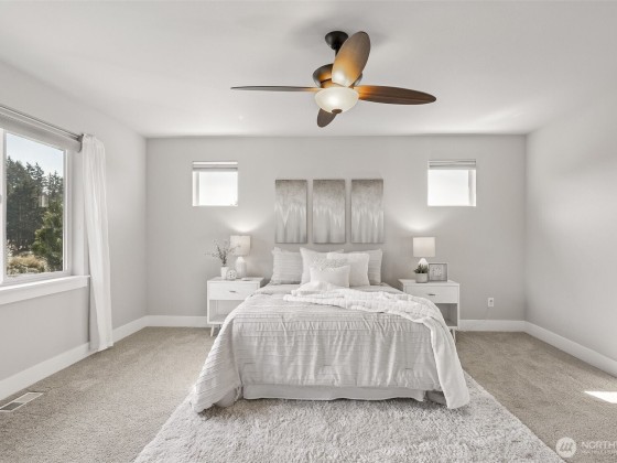 Welcome to this well cared for Rush Residential re-sale home in Newberry Trails! Step onto laminate floors throughout the main level w/ ample natural light. Open Kitchen w/ quartz counters, extensive island w/ sink, Stainless Steel appliances, range hood & oversized fridge / freezer! Great Room concept showcases dining area off of spacious living room w/ gas fireplace & full wall tile surround. Upper level w/ all 4 bedrooms, full hall bath & laundry room. Sizable primary en-suite w/ dual sinks, quartz counters, stand-up shower & soaking tub w/ tile surround. Fully fenced backyard w/ covered deck & exterior gas fireplace. Upgraded air conditioning, Puyallup schools, Front yard lawn service included, all on a corner lot! Assumable VA loan.