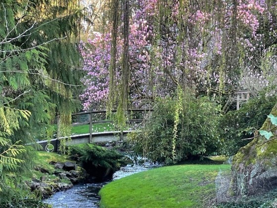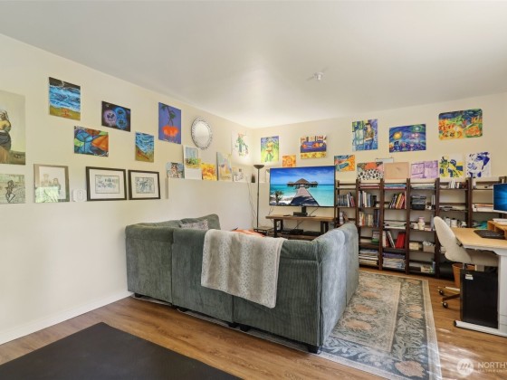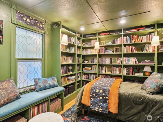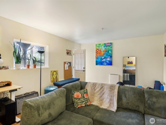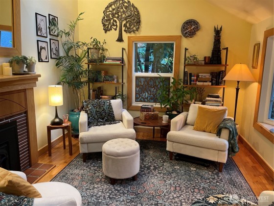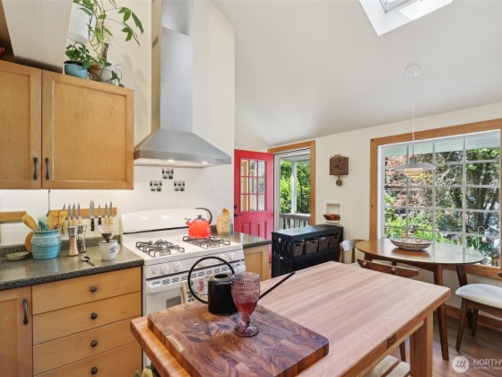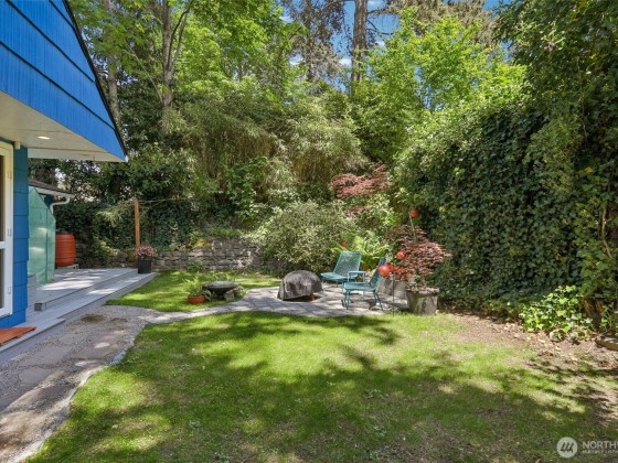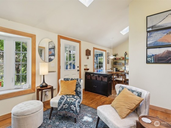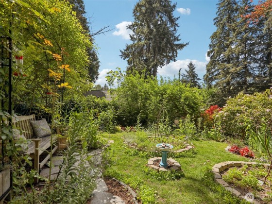 An artist’s paradise tucked away in lush, natural gardens—this Matthews Beach gem offers tranquility and privacy just minutes from parks, trails, and urban conveniences. Light-filled interiors feature vaulted ceilings, gleaming wood floors, skylights, and a gas fireplace. The open kitchen and dining area are ideal for gatherings or quiet mornings. With 3 bedrooms, 2 updated baths, and a laundry room all on one level, the layout is both charming and functional. French doors open to a fully fenced backyard oasis with greenhouse, shed, and workspace. New roof and updated electrical/plumbing. Finished garage adds flexible space for studio, gym, or more. A truly special home offering comfort, character, and inspiration in every corner.