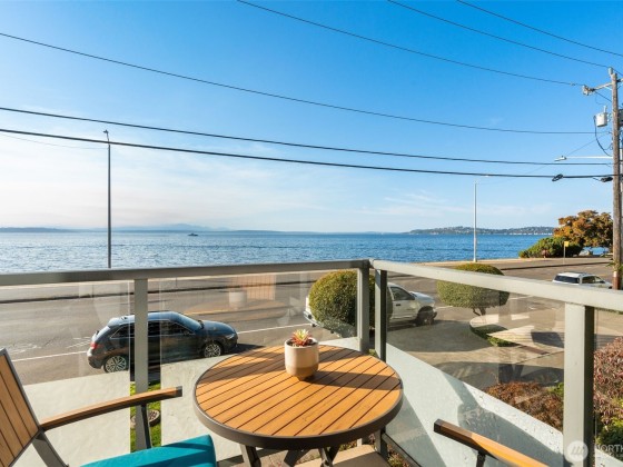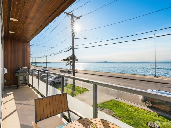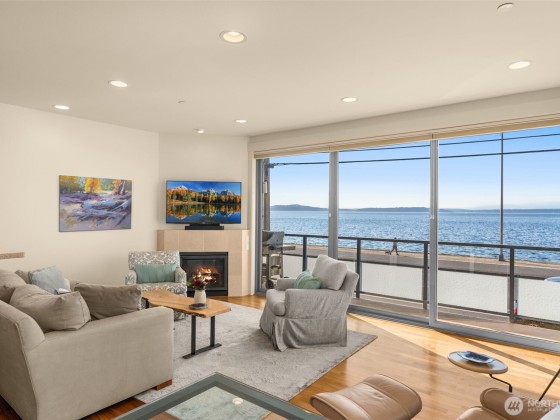 Experience sophisticated waterfront living in this rarely available contemporary boutique building. A secure elevator opens directly into your exclusive unit. Inside, floor-to-ceiling glass frames a dynamic view of Puget Sound, layered mountains & passing ferries. West-facing open floor plan is filled w/ natural light, inviting you to host or unwind while enjoying magnificent sunsets. Spacious primary ensuite offers a walk-in closet & five-piece bath (dual vanity, decadent soaking tub & spa shower). Excellent location! Easy access to scenic paths, beach parks, a promenade of restaurants, shops & cafes. Just a quick water taxi ride to downtown for work or play. High-quality construction, low dues & well-run HOA. Secure parking w/ EV charger.