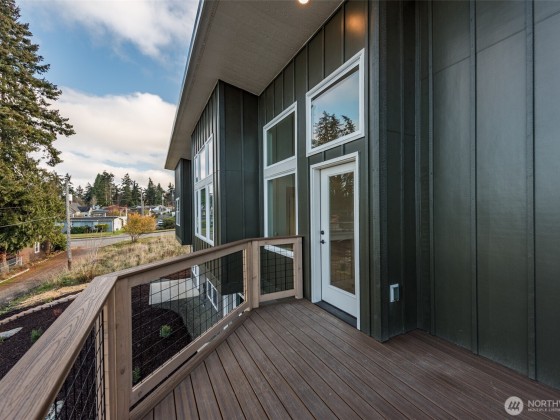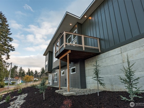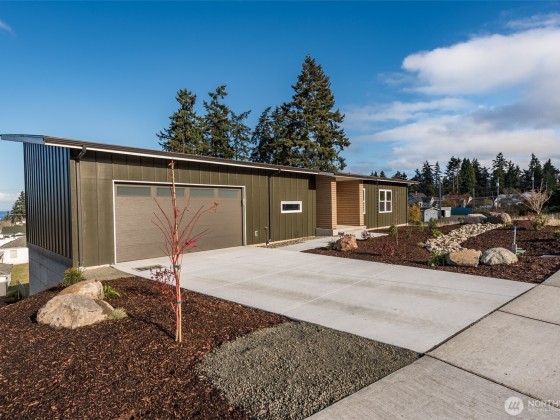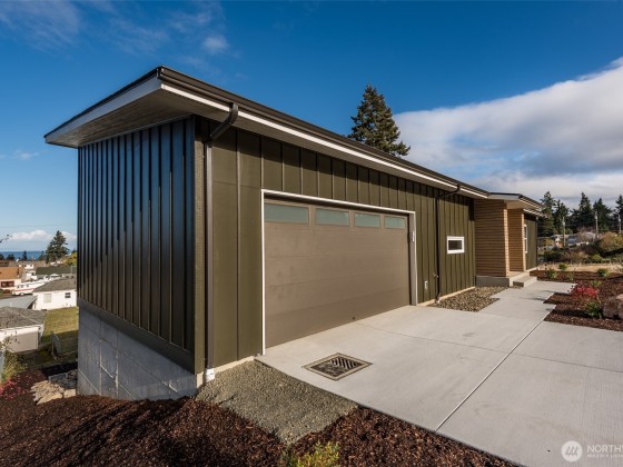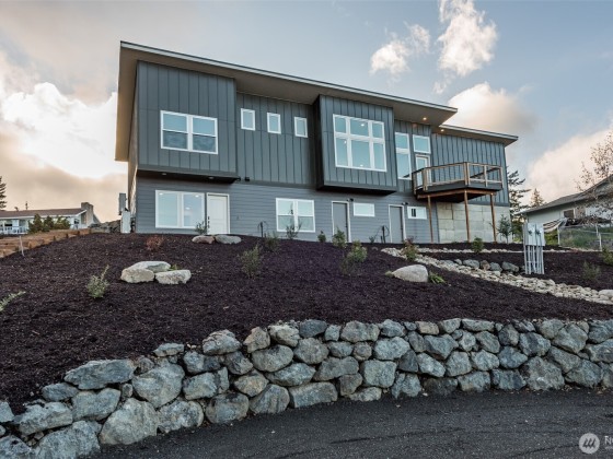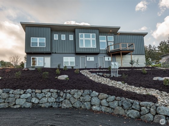 Beautiful new 2 unit water view home just north of Peninsula College in Port Angeles. Modern design and built by one of the areas best - Estes Builders. Stylish single slope roof, low maintenance landscape & separate access for each unit. Upstairs features a sleek 2 BR, 2 bath home plus den/office w/beautiful living room area w/vaulted ceilings and a wall of windows looking towards the water view. Modern kitchen with quartz counters, cherry cabinets, and a stylish window underneath bringing in extra light from the south. All brand new appliances including W/D. Served by 2 high-efficiency ductless heat pumps. Trex deck w/water views and a 2 car garage. On the lower level, accessed from the roadway below is the 1 BR unit with separate access.