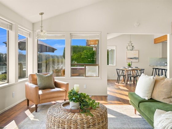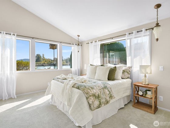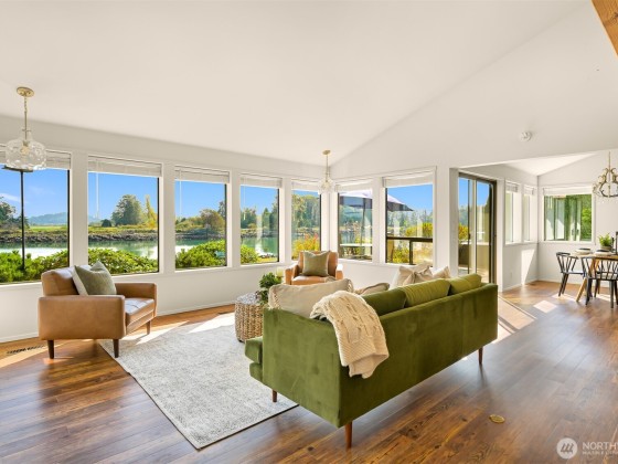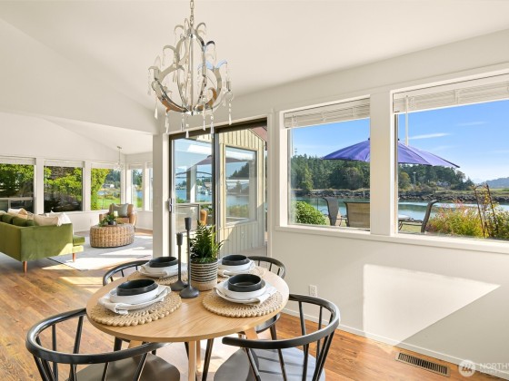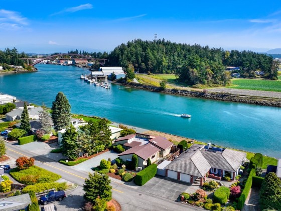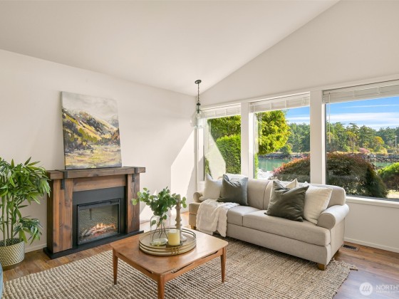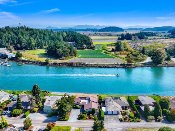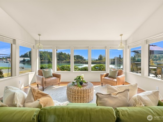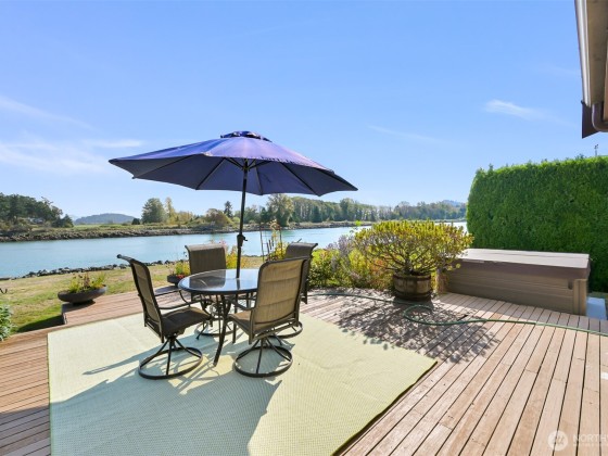Experience tranquil waterfront living in Shelter Bay at this beautifully updated, single-level home situated on leased land. Enjoy enchanting views of the Swinomish Channel, where tides shift, mountains rise in the distance, wildlife beckons, and luminous sunrises invite you to savor the moment. From the expansive deck & newer hot tub, watch the procession of boats pass like living art. Effortless comfort are yours with an open floorplan, soaring vaulted ceilings, remodeled kitchen, and newer furnace and heat pump. Just beyond the iconic Rainbow Bridge lies the charming waterfront town of La Conner. Shelter Bay amenities—pickleball, tennis, updated pool, par-3 golf, beach, marina, boat launch, & more make everyday feels like vacation!