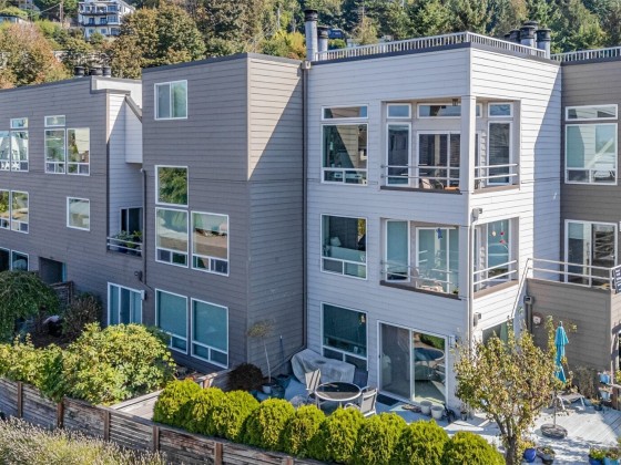 Top-floor Alki condo with panoramic views of Puget Sound, Olympics, and beautiful sunsets. Soaring 11-ft ceilings and light-filled 1BR + den that could convert to a 2nd bedroom. Freshly painted with new carpet and an updated ¾ bath featuring a granite-tiled walk-in shower and vessel sink. Open kitchen flows to dining and living areas with a cozy wood-burning fireplace. Direct access to a private rooftop deck. Includes secured garage parking with storage. Experience wildlife sighting including eagles, herons, whales as well as both recreationists and sailers alike with cose proximity to the beach, shops, and dining. Boutique 15-unit building offers beachside charm and privacy. Previous owner a watercolor painter inspired by this view.
