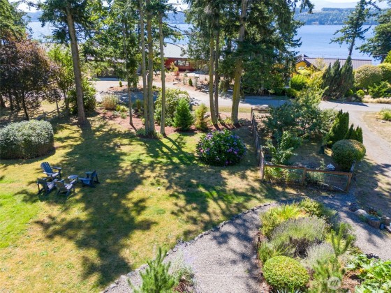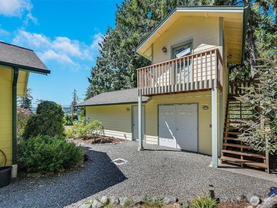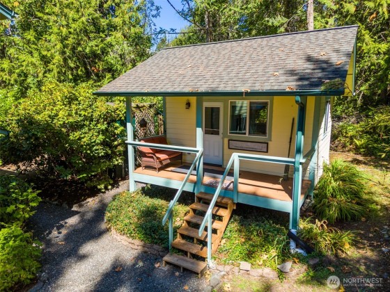 Charming south-facing home on tranquil Marrowstone Island w/ peek-a-boo water views. Vaulted cedar ceilings, a cozy pellet stove & abundant windows create a warm, inviting space. Well-appointed kitchen w/ propane cooktop opens to the dining area. Spacious main-floor bedroom offers walk-in closet & full bath w/ jetted tub while the oversized bedroom upstairs features views, a walk-in closet & ¾ bath. Detached single-car garage includes a private art studio w/ views & workshop below. Plus an additional studio behind the home creates a ideal gym, craft, or bunk room. Enjoy evenings on the wrap-around porch overlooking a thoughtfully planted yard with fruit trees & garden space, or relax on the spacious private patio.
