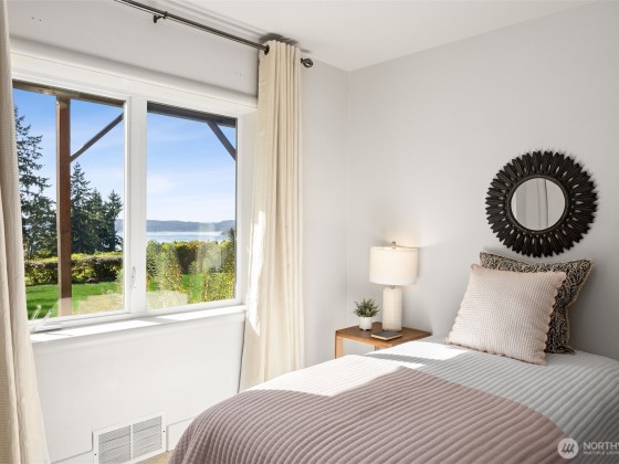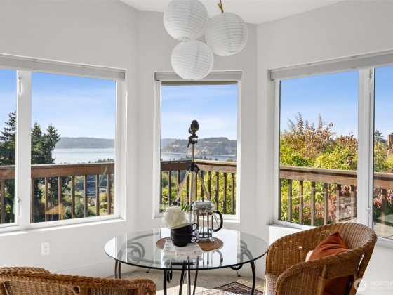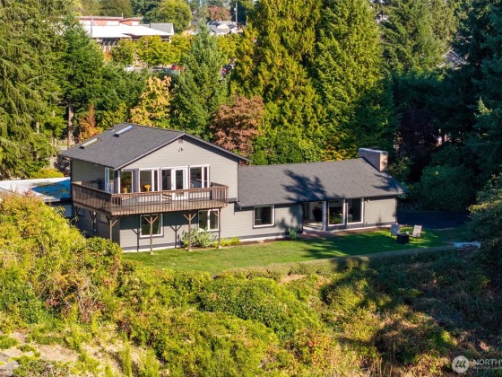 Pristine, Sophisticated, Elegance in Narrowmoor with Expansive Views of Puget Sound and The Bridge. Tucked away and close to local amenities, this desirable home is lovingly cared for and updated with quality craftsmanship complimenting the original era and architectural details. Large living & dining areas have views from all windows and open to the spacious backyard. Gourmet kitchen with SS appliances, Dacor warming drawer, Viking range & hood, double oven, quartz counters and eat-in area . Bonus room off garage with separate exterior entry set up as festive Tiki Bar. Two bedrooms on main floor have views, and Primary Suite with sweeping views is adorned with large deck, vaulted ceilings, gas fireplace and luxurious bathroom.