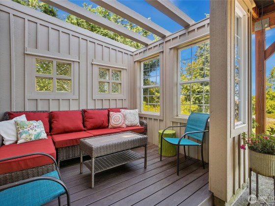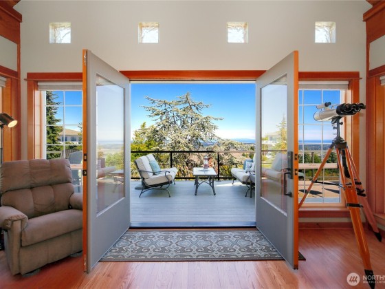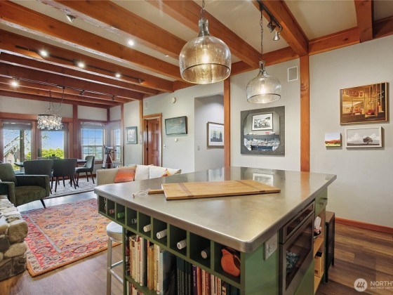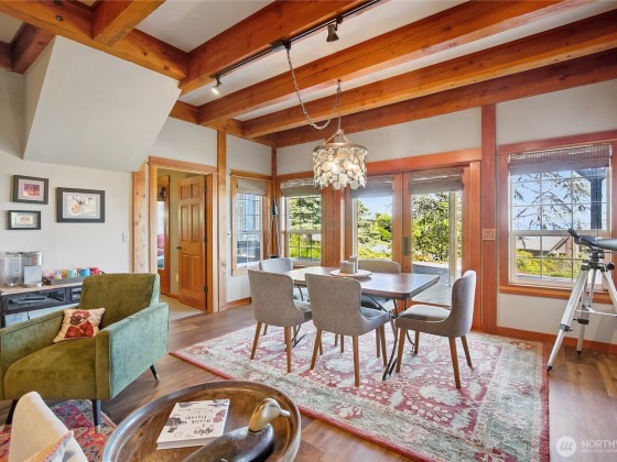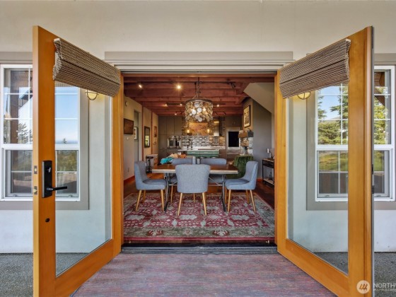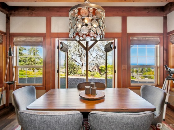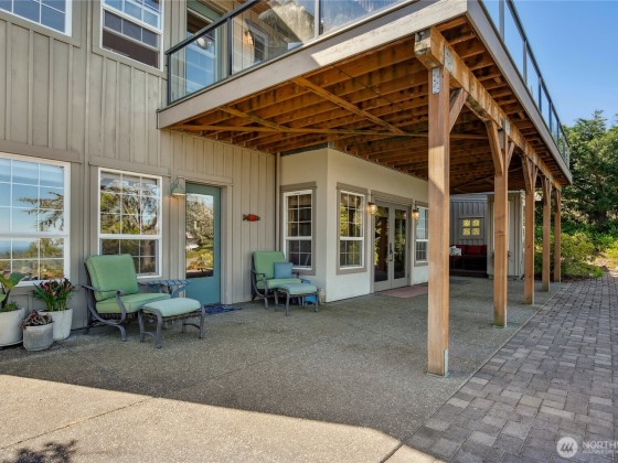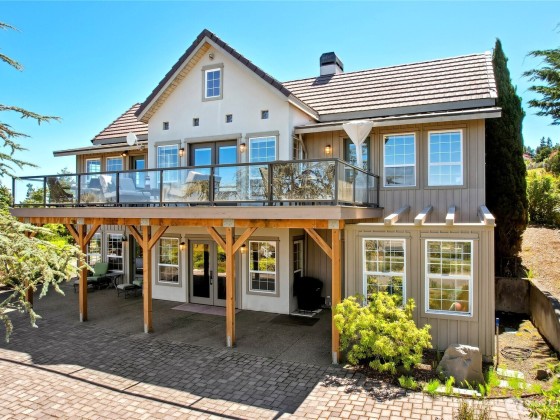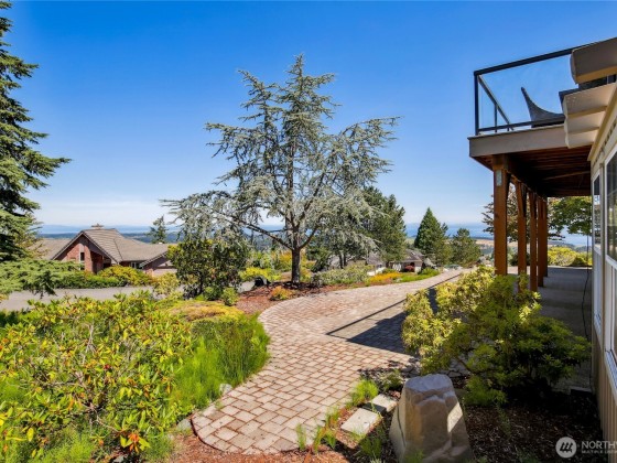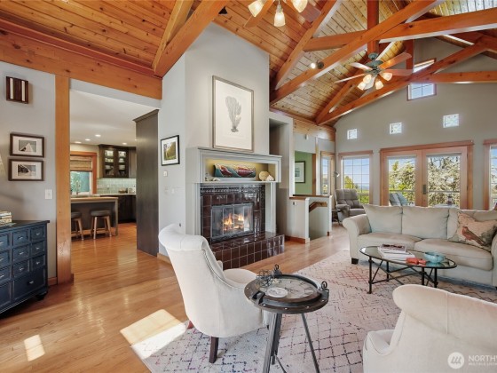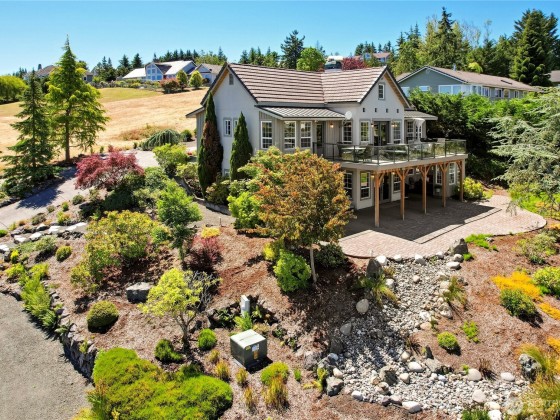 Experience luxury living on a beautifully landscaped half acre with stunning views of Sequim Bay, the Puget Sound, and Mt. Baker. This exceptional home features a concrete tile roof, wood beam ceilings & a lovely blend of flooring throughout. The main level offers a spacious living room, cozy den, and a chef’s kitchen with glass tile backsplash, quartz counters, island, stainless steel appliances, wine fridge, and dining nook. The primary suite includes a private ensuite & deck access. The lower level boasts a second full kitchen, stone fireplace, living room, three bedrooms, a bathroom, as well as patio access. This floorplan could be ideal for multi-generational living if needed, and definitely provides opportunities for a home office.